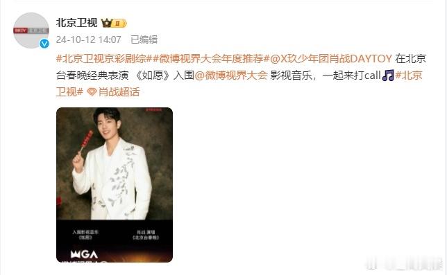 #北京卫视给肖战如愿打call# 肖战入围微博视界大会!肖战在北京台春晚经典表演 《如愿》入围微博视界大会影视音乐,一起来为肖战《如愿》打call吧!