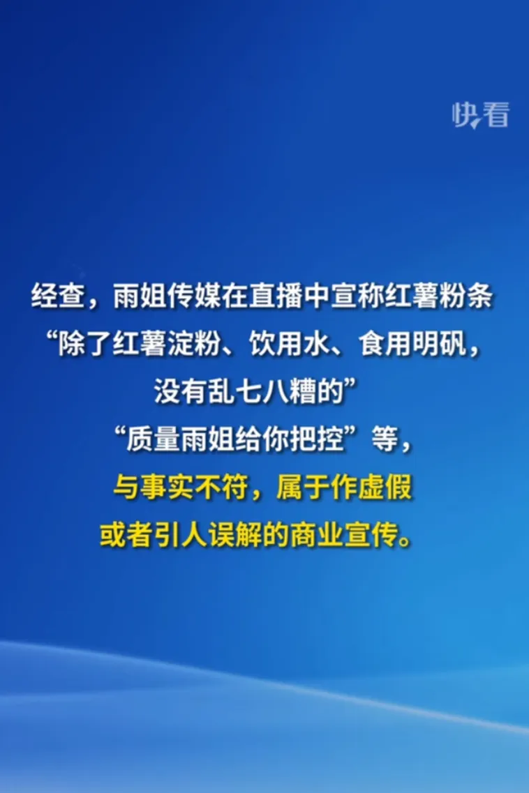 据悉,雨姐传媒与六河公司签订了直播推广协议,对红薯粉条进行推广销售。然而,经检测发现,该粉条未检出红薯源性成分,却检出了木薯源性成分。但在直播过程中,“东北雨姐”宣称“除了红薯淀粉、饮用水、食用明矾,没有乱七八糟的”“质量雨姐给你把控”等话语,这显然与事实严重不符。