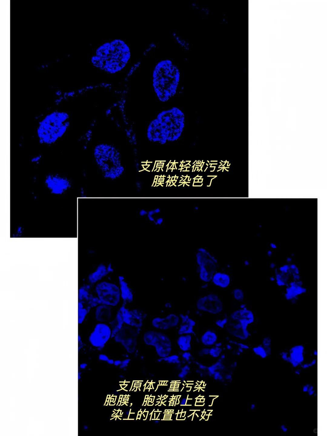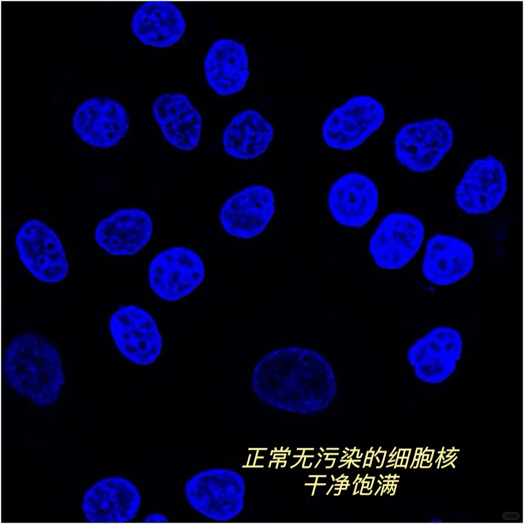 用状态好,未被污染的细胞去做IF,状态好的细胞伸展很开,染色效果也更好,若细胞支原体污染,可能会产生图4图5的现象,非特异性染色严重且去不掉,染核染抗体都会被染上乱七八糟的东西。