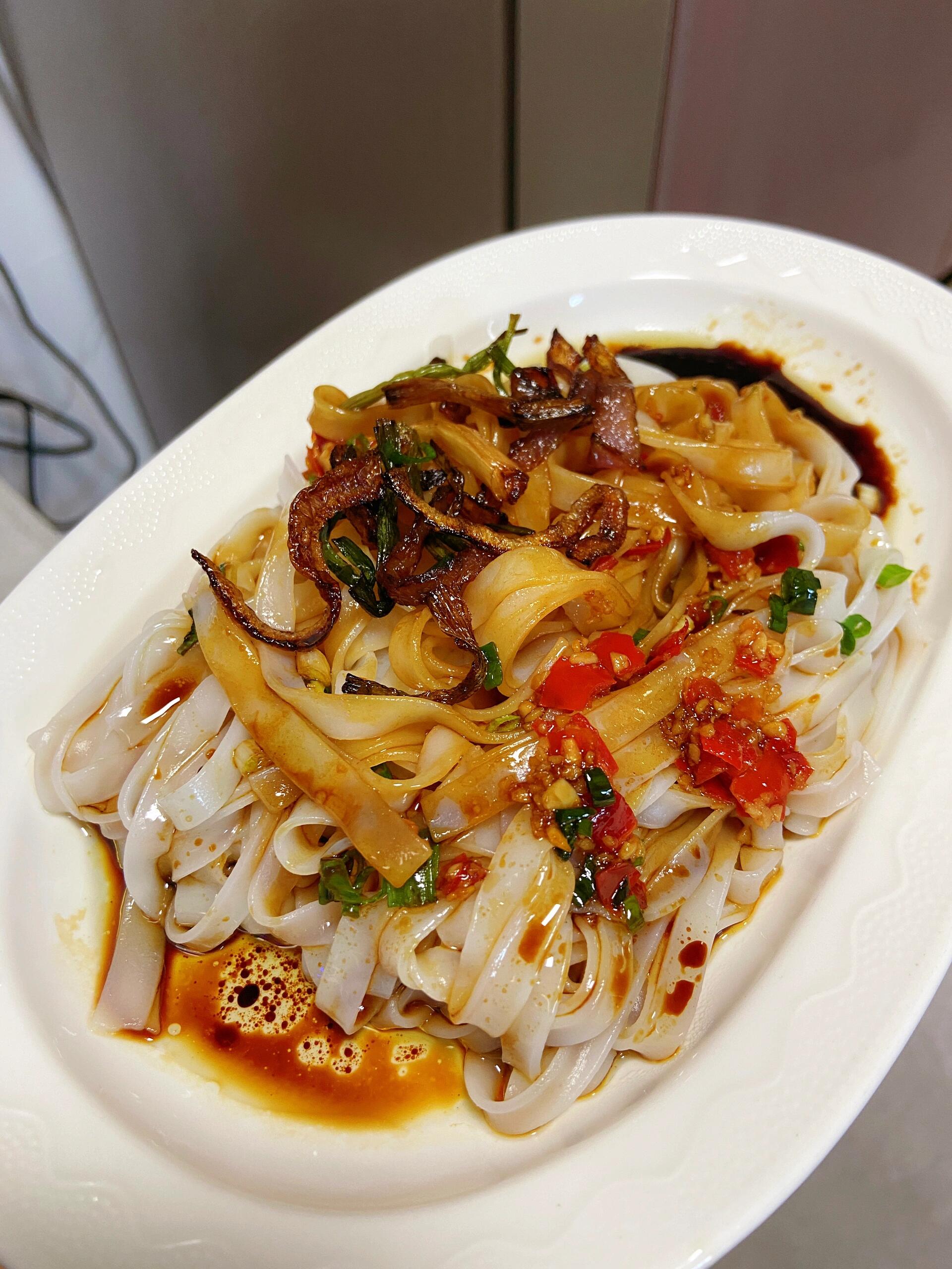 你们一定要试试,超级无敌香的拌粉,河粉很滑很薄,口感巨好,裹上葱油酱汁和剁椒绝了!比肉还香 做法写在图片上啦 酱汁:1勺老抽+4勺生抽+半勺白糖,搅匀到糖融化再倒入葱油里。 这个葱油酱用来拌粉 拌面都超好吃。味道比外面卖的更好,稍微带点甜口,不会齁咸。 剁椒酱一定要加,特别提味,巨香!!