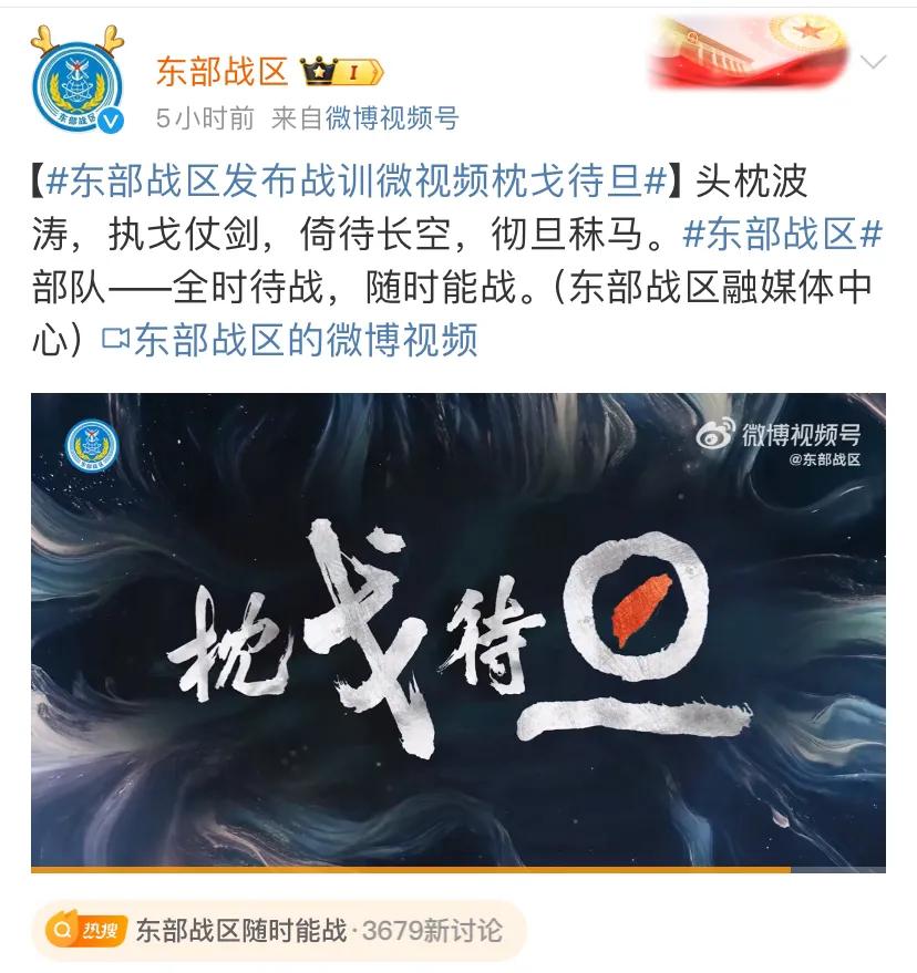 新加坡联合早报今天报道:“继赖清德在双十讲话后,中国大陆解放军东部战区星期天发布了‘枕戈待旦’战训视频,引起外界关注解放军是否会再次发动对台围岛军演。” [机智]评几句:会不会有“联合利剑-2024B”演习,相信这两天就会清楚了。在东部战区发布的“枕戈待旦”战训视频中,“旦”字的正中为宝岛地图,而且该视频的长度为:01:01,所以引发众多网民的联想,并呼吁“元旦统一台湾”。历史车轮滚滚向前,台湾统一必然实现,期待那一天早日实现。