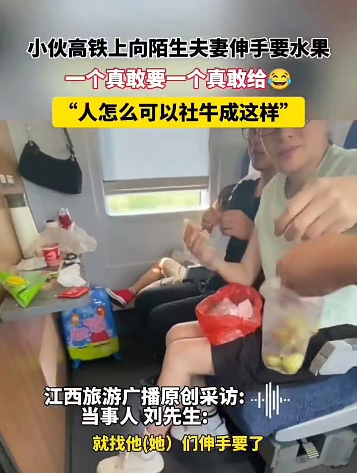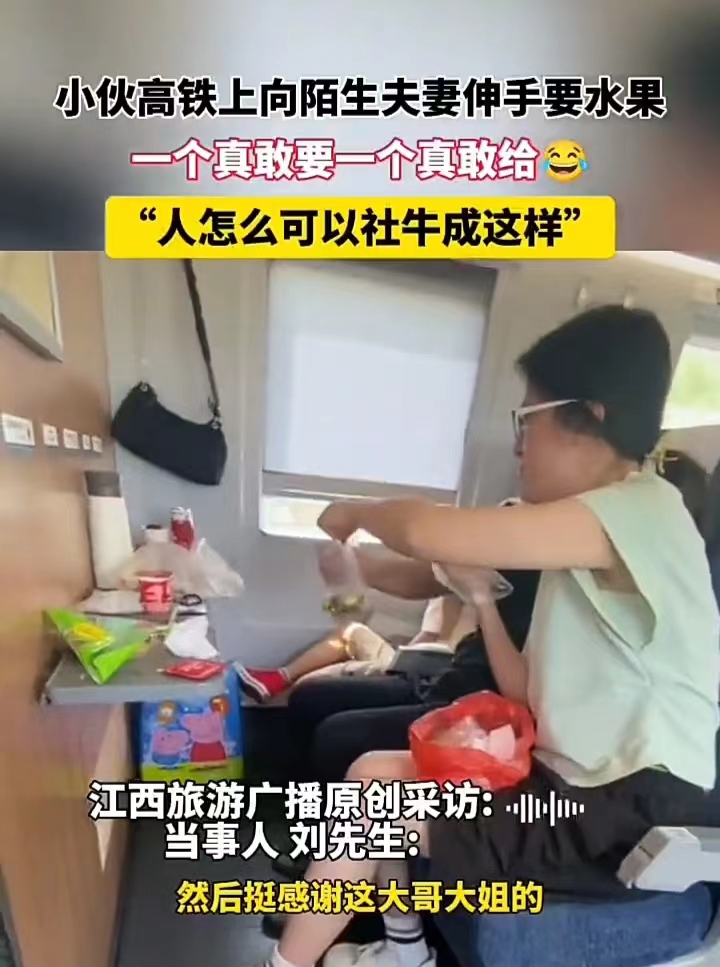 10月10日,湖南一名小伙乘坐高铁时,看到旁边位置坐着的一对夫妻正在吃黄瓜,于是壮着胆子伸手询问,“我能吃根黄瓜吗?”只见夫妻俩先是一愣,随后开始给小伙找黄瓜,但是由于黄瓜已经吃完了,便给了小伙青枣。网友:“人怎么可以社牛成这样!”