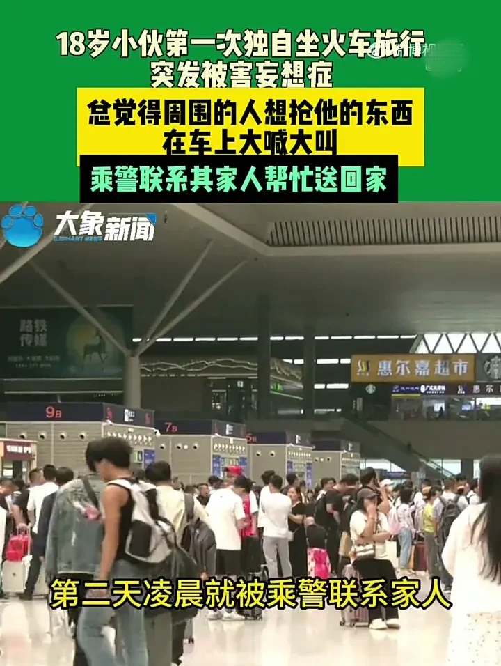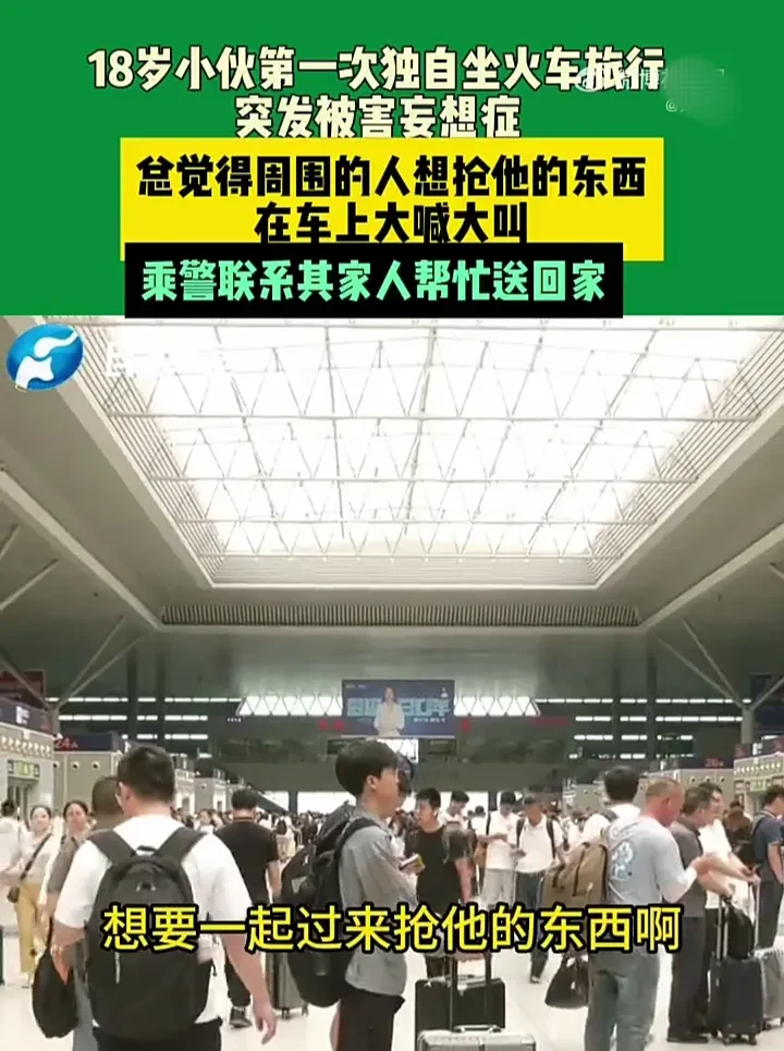近日,河南郑州一位医生接诊了一名18岁的大学生,得知他第一次独自坐火车旅行,想锻炼一下自己,结果上火车后,突发被害妄想症,总觉得周围的人想要抢他的东西,就连乘警也被攻击了,于是便将他送回家。