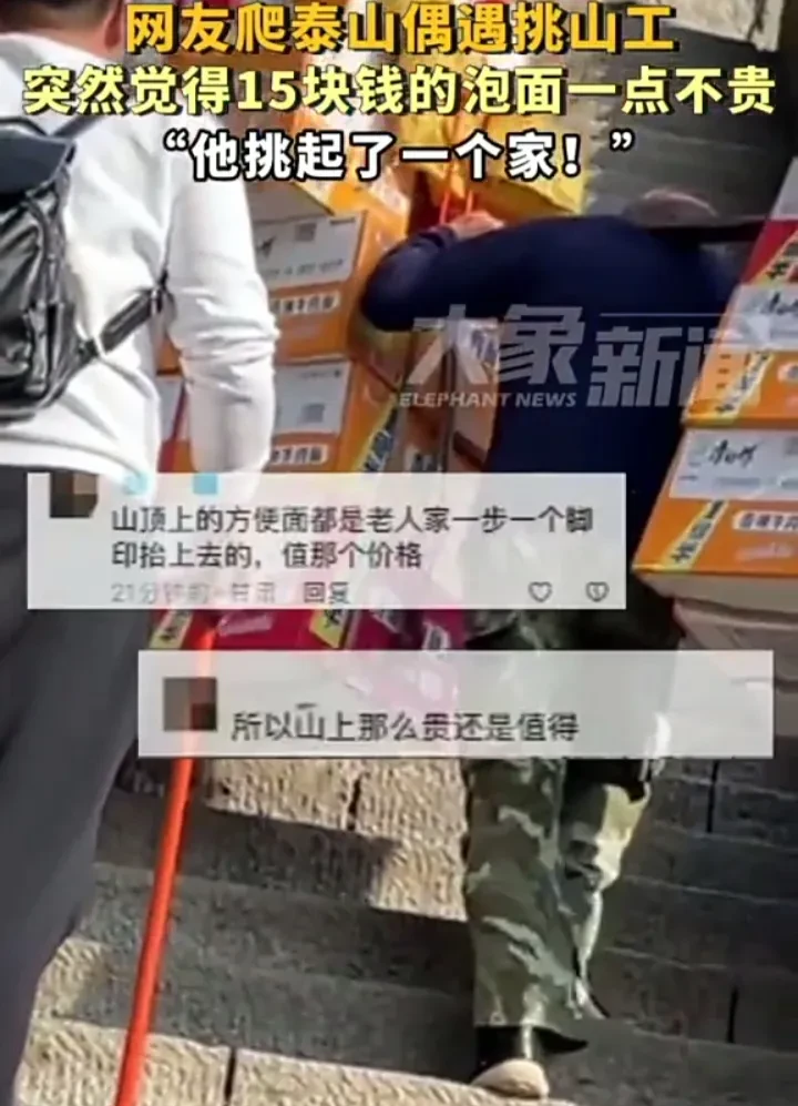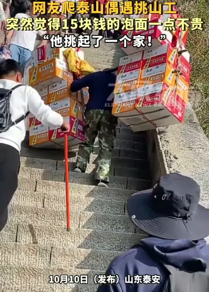 10月10日,山东泰安一名网友在爬泰山时,看到一位挑山工挑着几十箱泡面走在台阶上,因为太重,有时候他刚上一步,就不得不退回来保持平衡。网友:“突然觉得15元的泡面一点也不贵!”