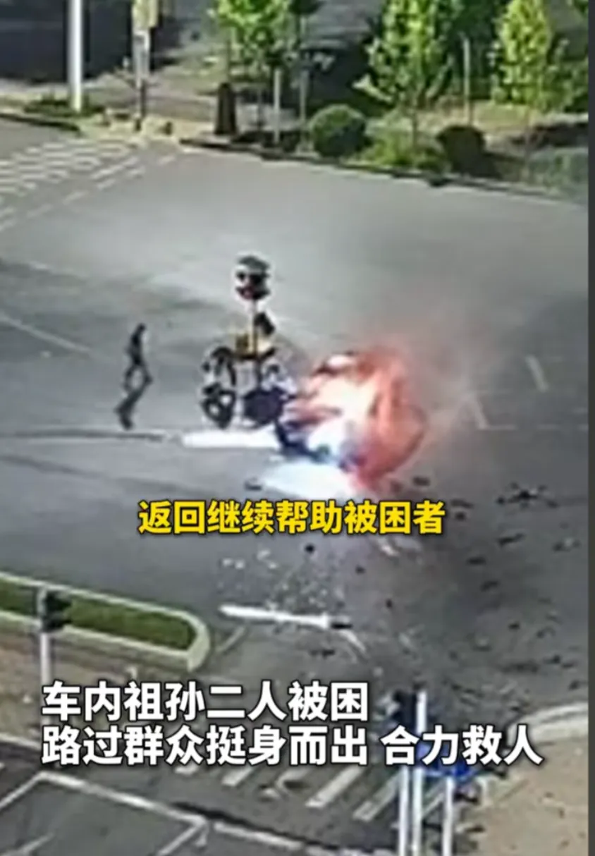 众人合力两分钟救出被困爷孙,近日,在山西晋城发生了一起惊心动魄的事件。一辆轿车突发事故后自燃,车内爷孙两人被困,情况万分危急。