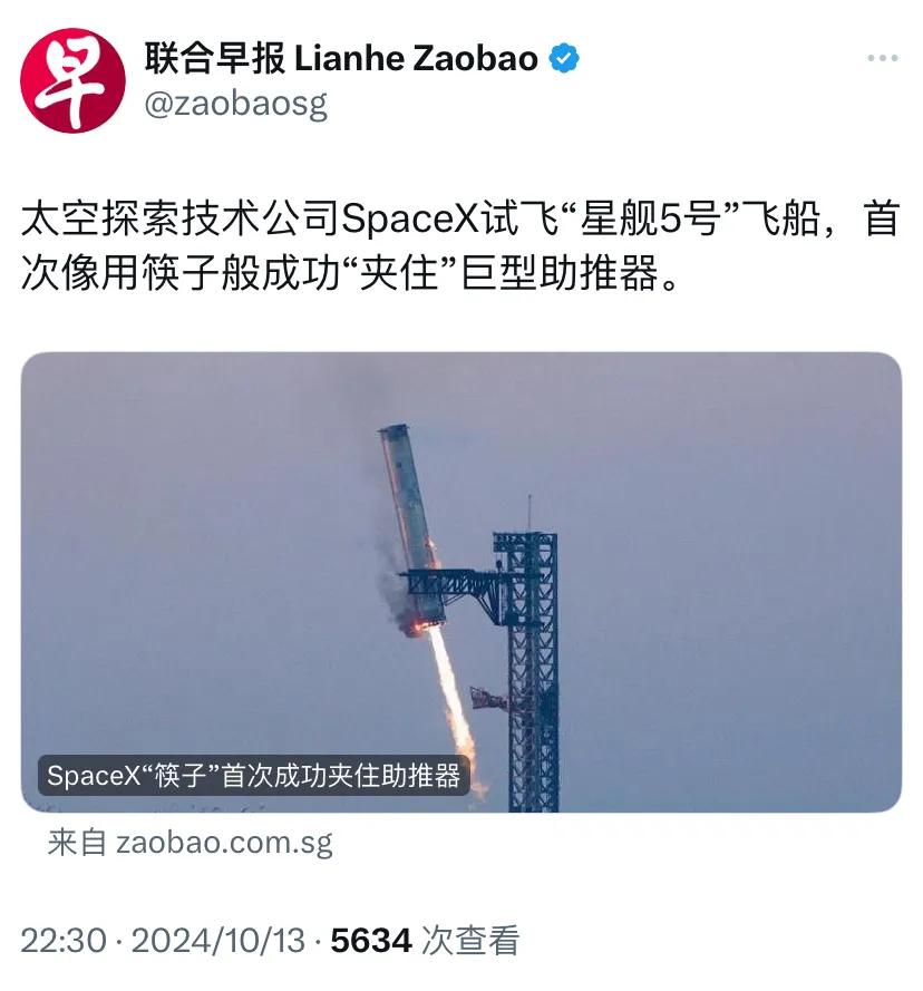 据外媒报道,太空探索技术公司SpaceX对其“星舰5号”飞船进行了试飞,并首次成功采用类似用筷子夹取的方式“捕获”了巨型助推器。 [机智]评几句:此次试飞展现了SpaceX在太空技术领域的又一重大进步。在减速、对接以及末端修正等关键环节,SpaceX均展现出了极高的精准度。此外,与目前SpaceX的猎鹰九号火箭相比,后者通常降落在地面或回收船只上,需等待数日方能运回厂房进行再次发射。而“星舰5号”则旨在实现快速可重复使用,通过直接降落到发射塔上,仅需在重新加注燃料后即可直接再次发射,从而极大地节省了时间成本。