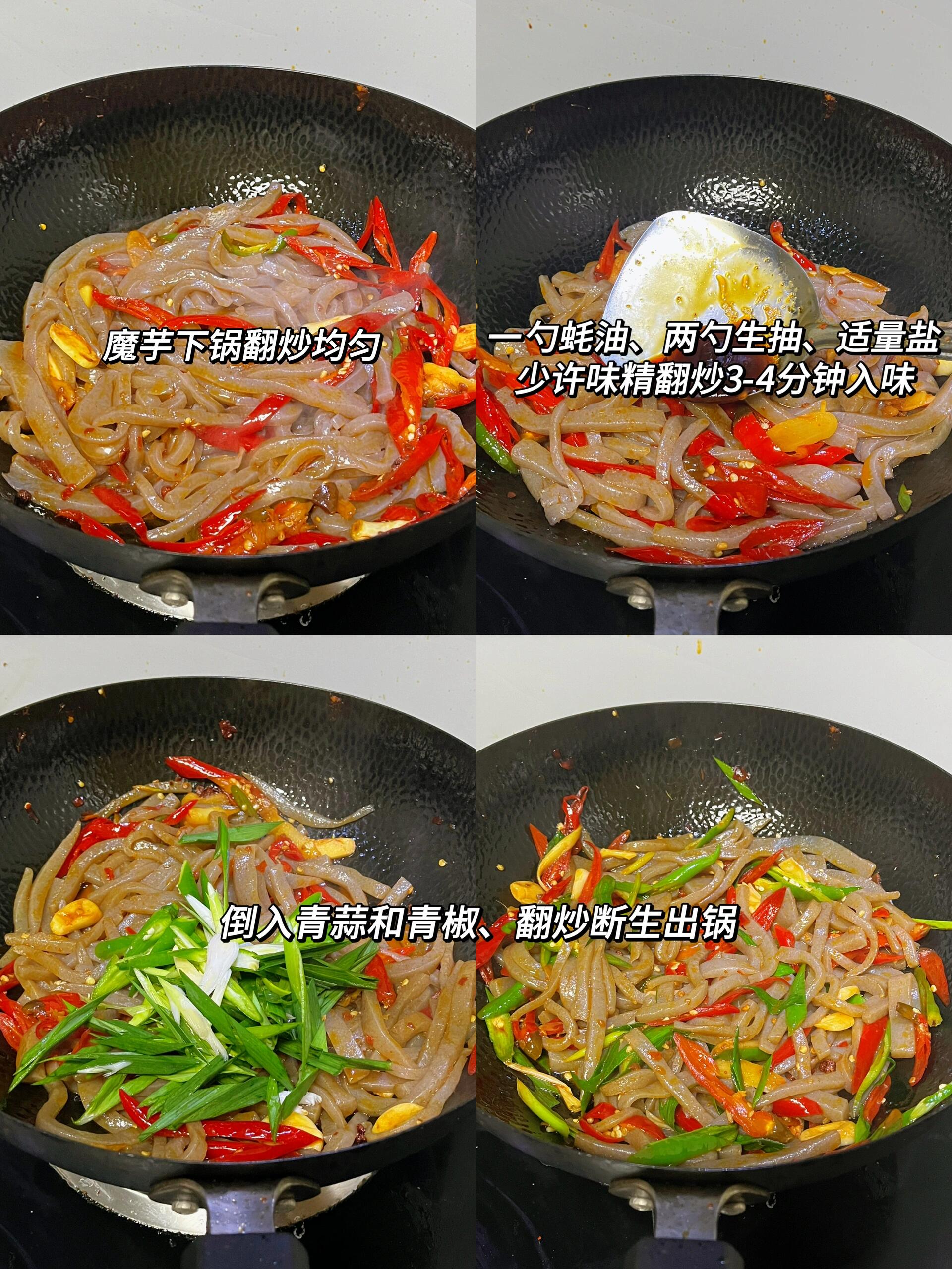 魔芋和泡菜真的是绝配,超级入味巨费米饭 食材:魔芋、泡椒、泡姜、青椒、青蒜 调料:盐、蚝油、生抽、大蒜、豆瓣酱 做法 1、切泡椒、泡姜、大蒜、青蒜苗、青椒备用 2、魔芋切丝冷水下锅加盐,焯水十分钟煮出碱味,捞出过凉水冲洗 3、油热放一勺豆瓣酱炒出红油,加泡椒姜蒜炒出香味,魔芋下锅翻炒均匀 4、放一勺蚝油、两勺生抽、适量盐少许味精翻炒3-4分钟入味,最后倒入青蒜和青椒、翻炒断生出锅