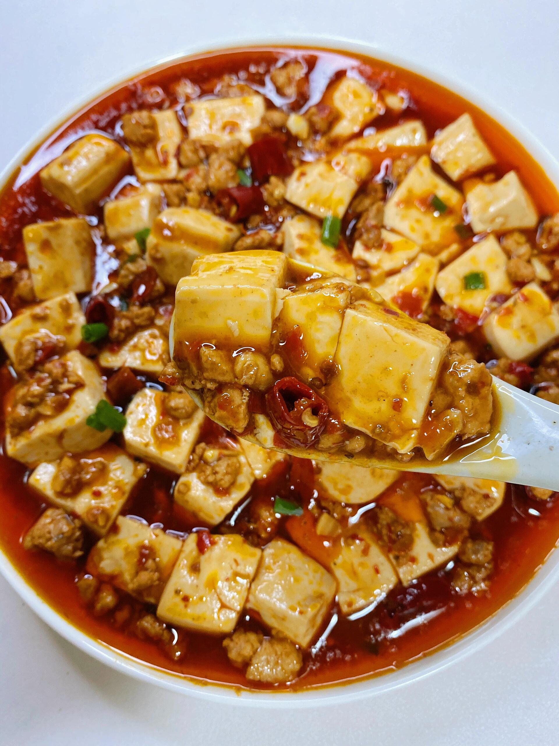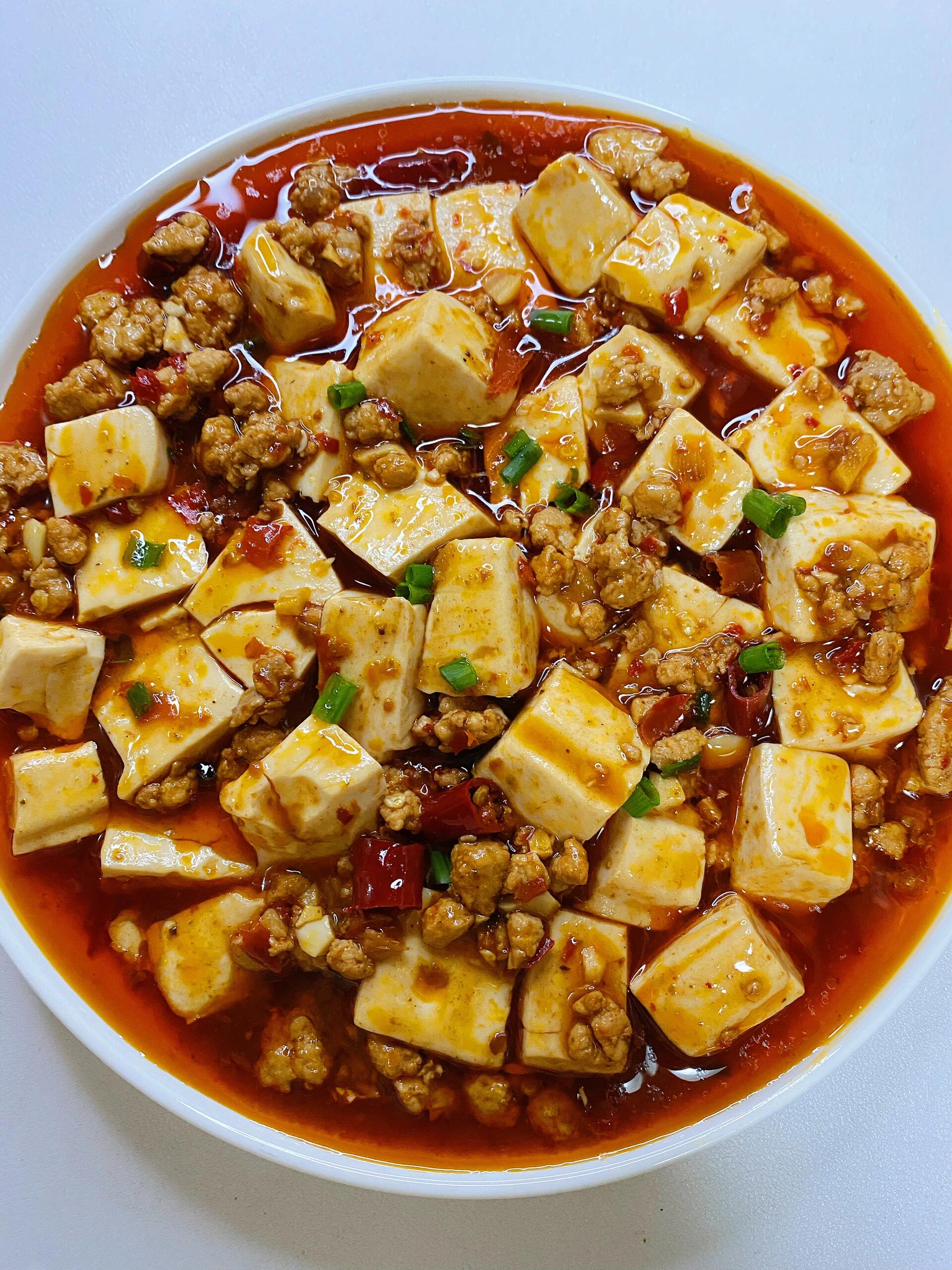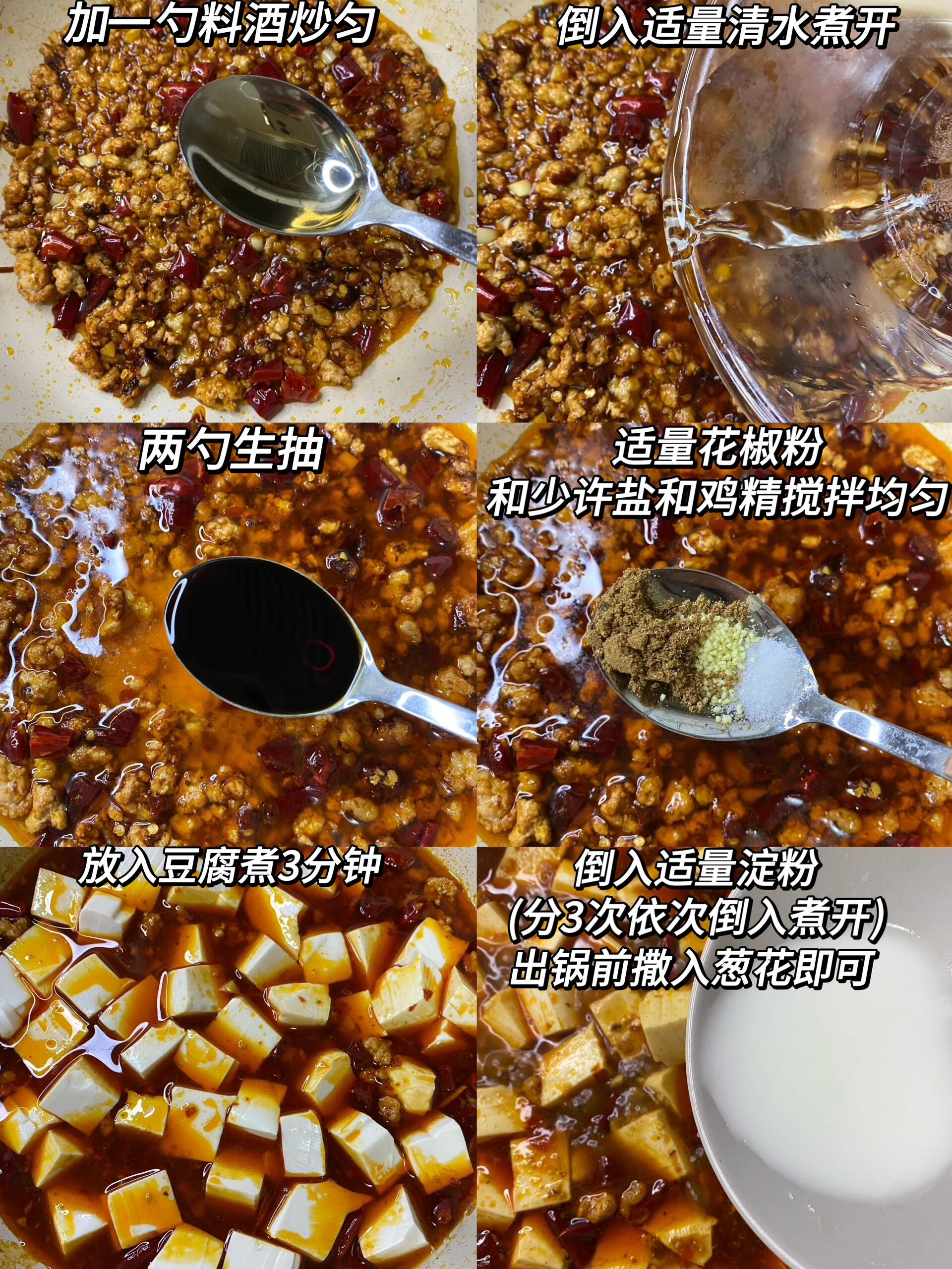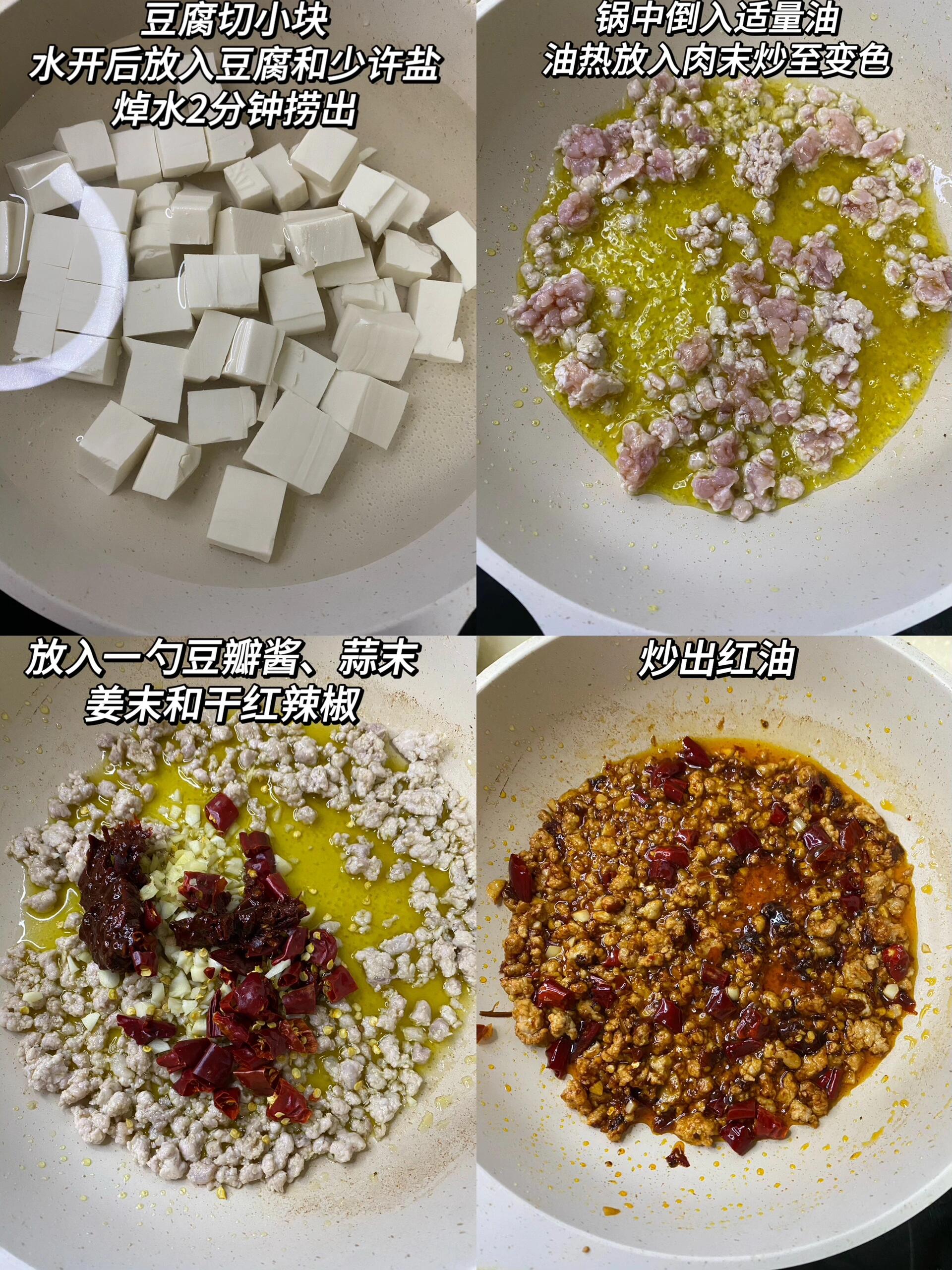 食材:豆腐、肉末 做法:1、豆腐切小块,锅中水开放入豆腐和盐焯水两分钟捞出 2、锅中倒入适量油,油热放入肉末炒至变色,放一勺豆瓣酱➕姜蒜末➕干红辣椒炒出红油➕一勺料酒炒匀,倒入适量清水煮开,➕两勺生抽➕适量花椒粉➕少许盐和少许鸡精搅拌均匀。 3、放入豆腐煮3分钟,倒入水淀粉(分3次依次倒入煮开,出锅前撒入葱花即可。