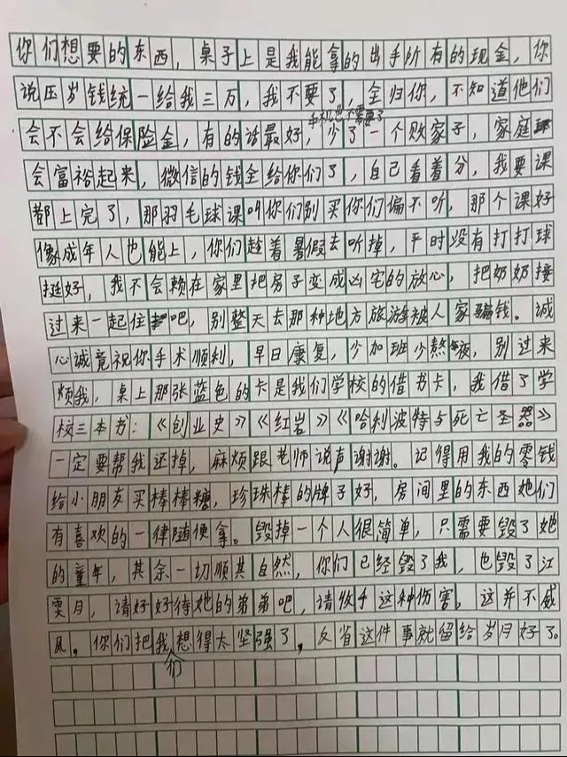 网上很多人都在说这个小女孩的遗书,这是一个老新闻,事实上压垮孩子的最后一根稻草,往往就是家长,期望值太高,付出太大,而没有得到很好的收获,这样家长并不是为了孩子,而是为了他们自己的虚荣心,把孩子当成他