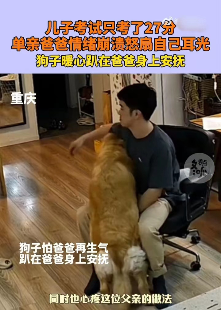 近日,重庆一名单亲爸爸得知儿子只考了27分,觉得非常地生气,舍不得对儿子动手的他无处发泄情绪,于是便用力扇自己耳光。这时一旁的狗狗看到后,怕主人再次伤害自己,便上前用脑袋挡住主人的手,无声地安抚。