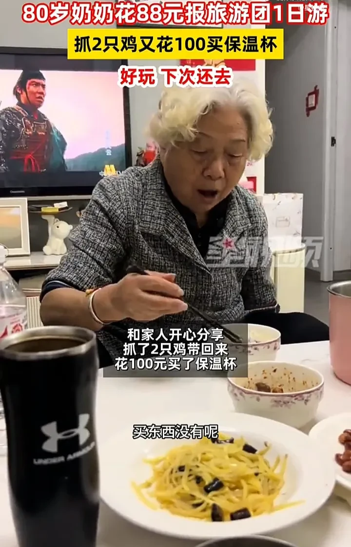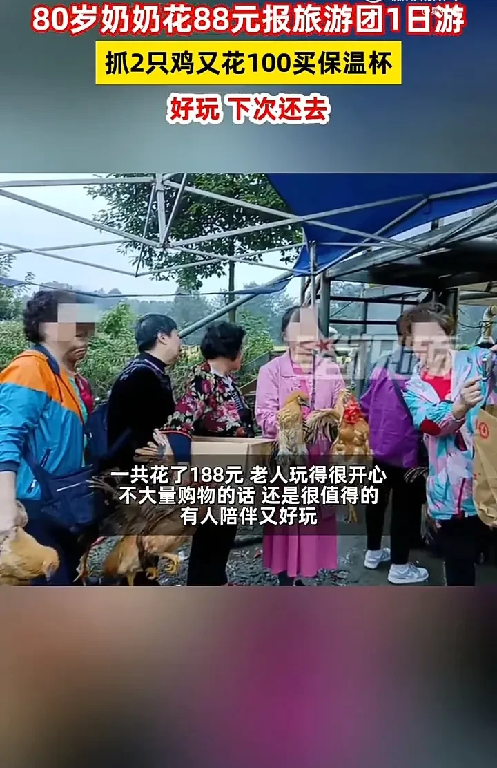 10月13日,四川成都一名女子发视频称,自己80岁的奶奶花88元报旅游团,去都江堰一日游抓鸡,早上6点出门,晚上9点半抓了两只鸡带回家,虽然花了100元买保温杯,但奶奶觉得很开心。
