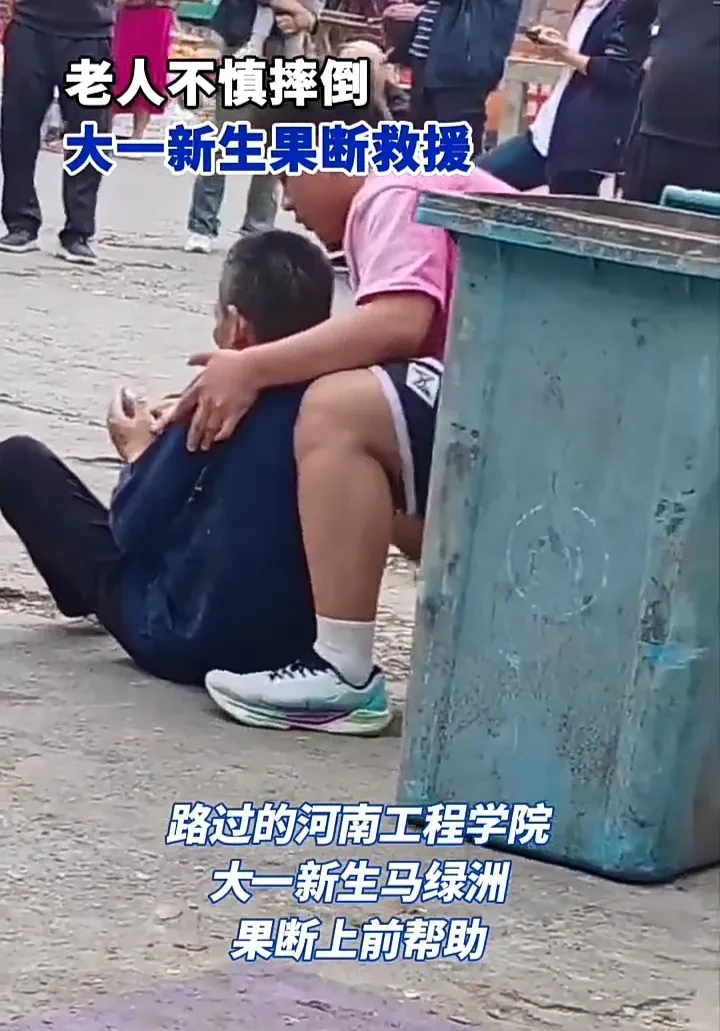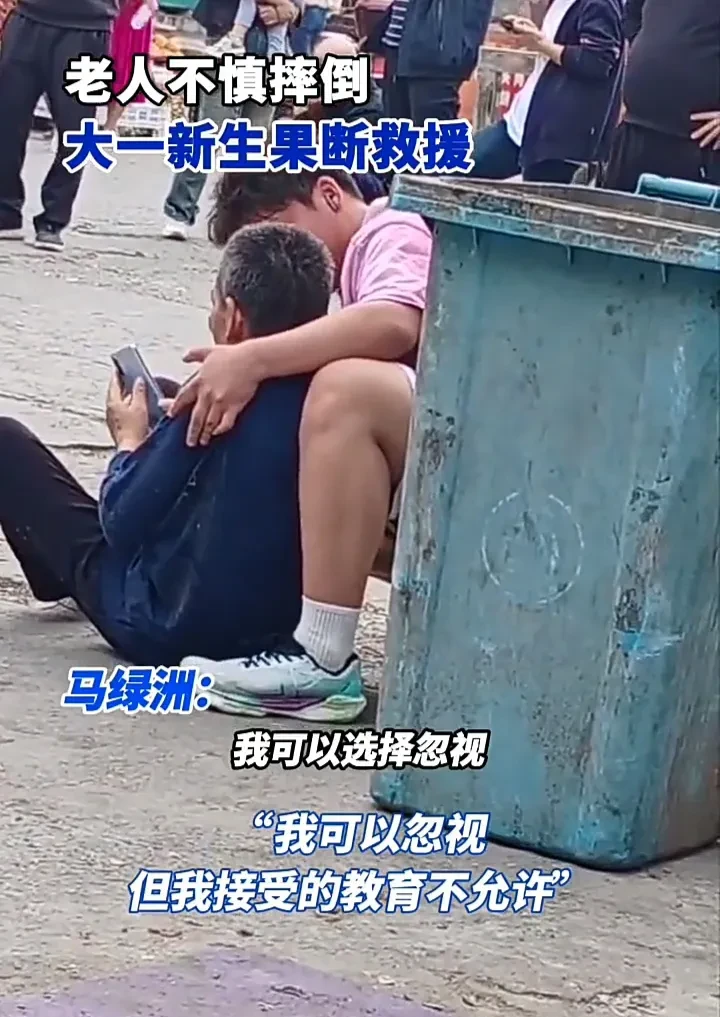 10月11日,河南郑州一条街道上,一位老人不慎摔倒在垃圾桶旁,这时一名河南工程学院的大一新生见状,果断上前帮助,并联系老人家属前来。对此他表示,我可以忽视,但我接受的教育不允许。