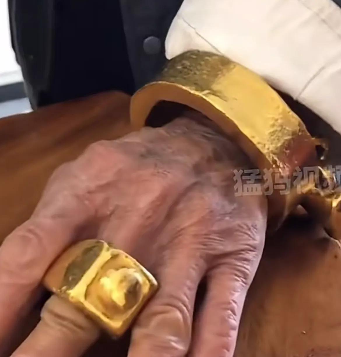 豪横!90岁老人随身携带4斤多重金手镯,“还有金腰带,家人不让带出来”! 大爷手上戴个金戒指,大金镯子,金链子,金灿灿的引起旁边人的惊叹! 别看工艺,在重量面前都是浮云!真是名副其实的豪横啊!(网图侵删)