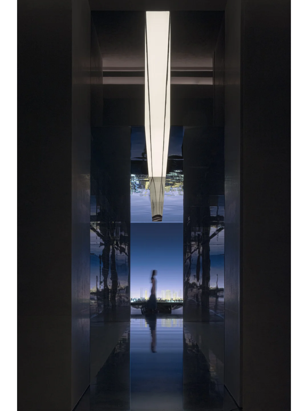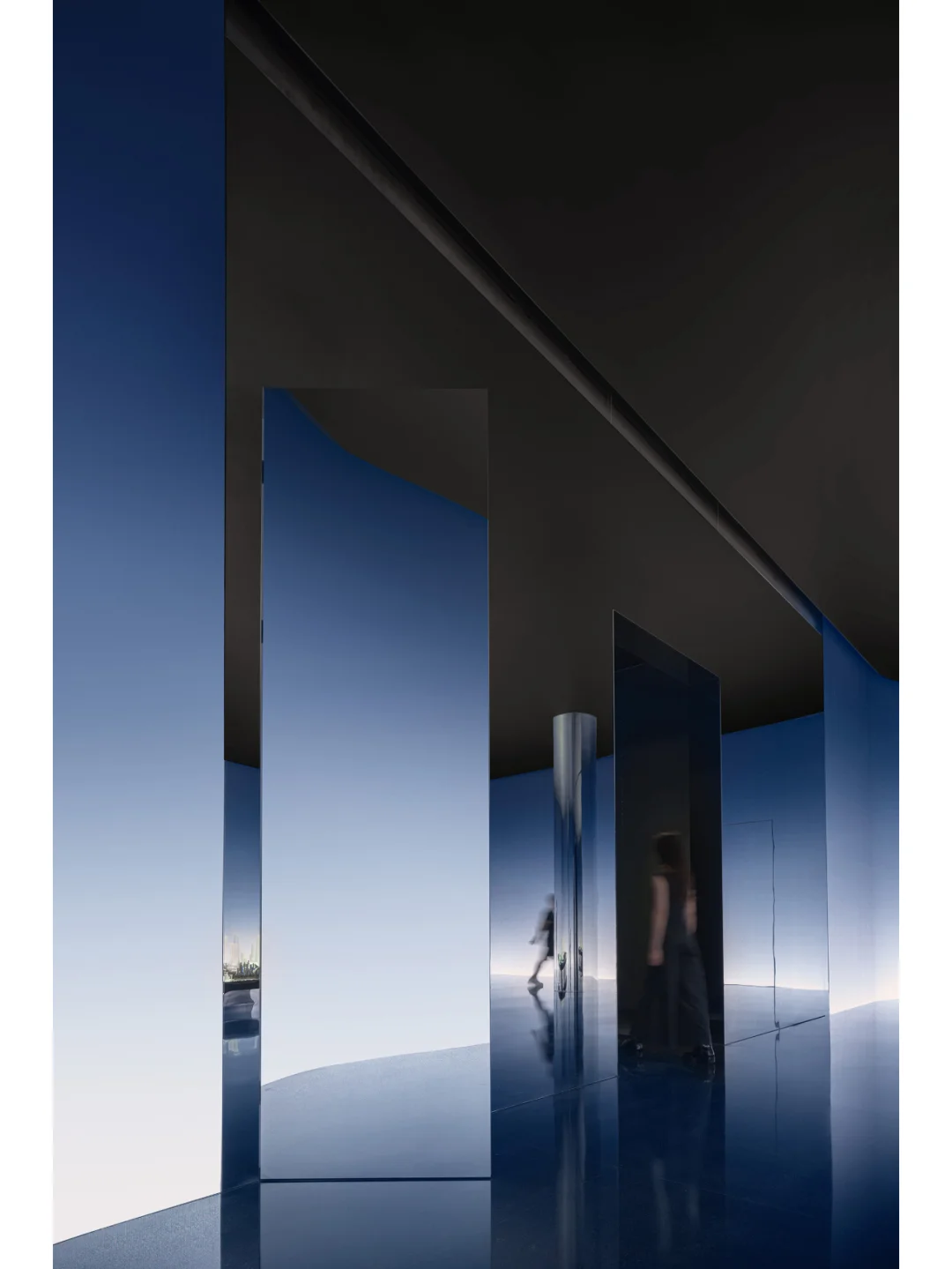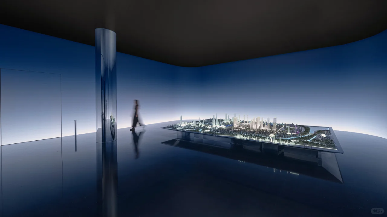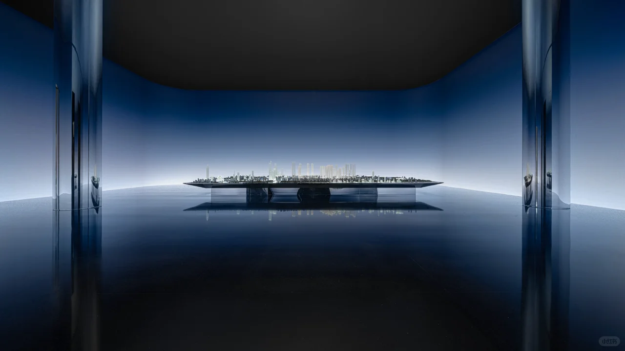静态时刻,渐变的天际线下展示的建筑群落模型呈现出了其最简单的轮廓。纯粹及虚化的背景聚焦了观赏者的视线,在无边界的空间包裹中体会一种不真切的未来感。