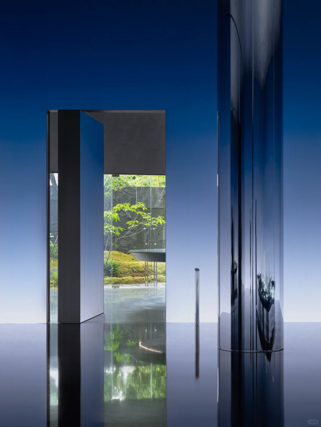 直径4⽶的悬浮圆台顺应而生,消解了原建筑内的两个过于强势的结构柱。从沉浸式的场景中走出后,纯粹⾃然的空间材质与生机勃勃的庭院,将体验者带回了现实。