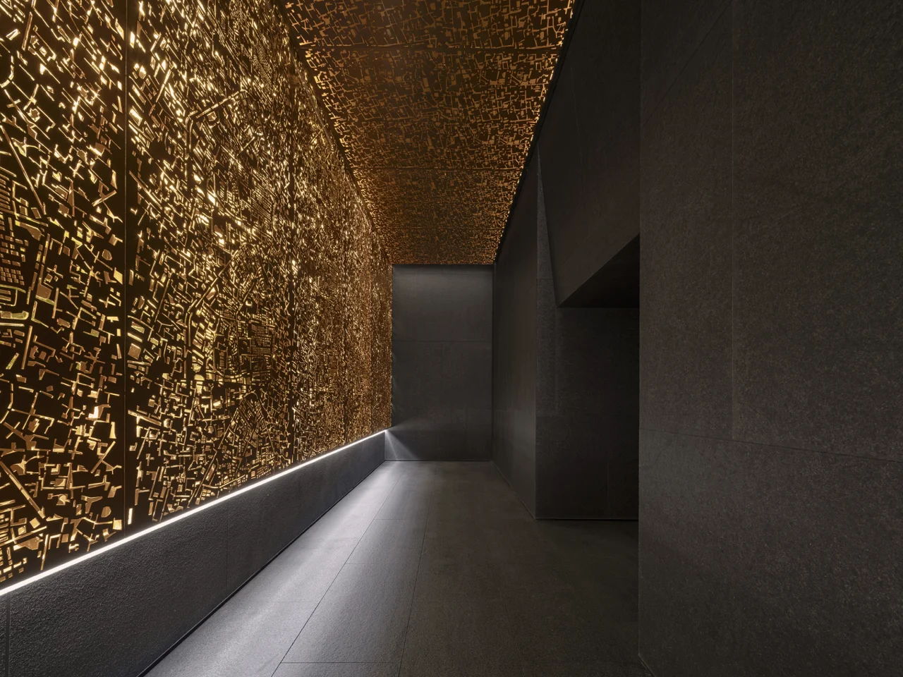 新增的展示空间的立面需以一个适合的设计尺度,以不破坏外立面风貌相对和谐的方式置身于其中。万社设计以镂空的当地城市脉络图案辅以金色的立面,呼应及连接原建筑特色及新的场地属性。