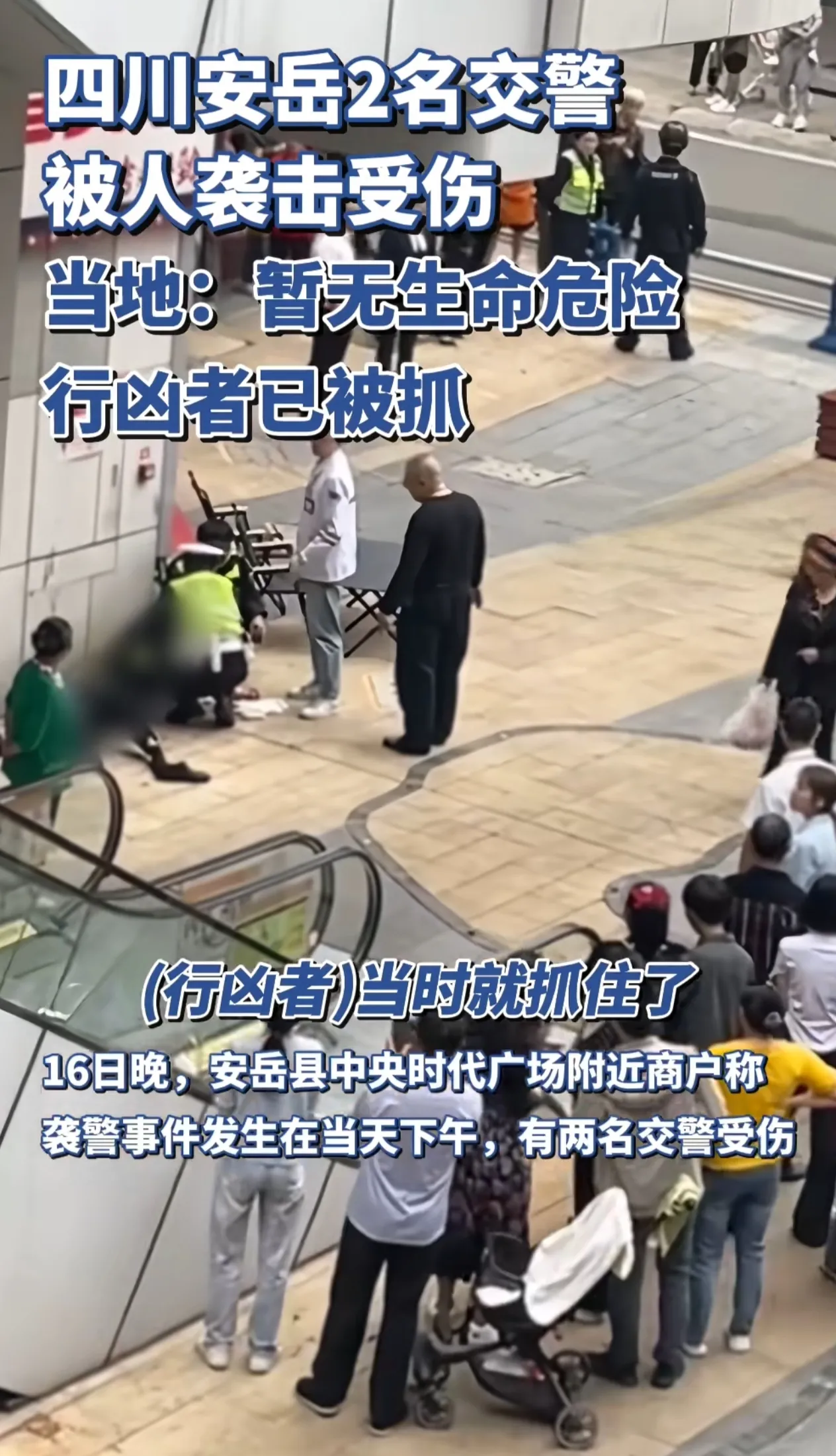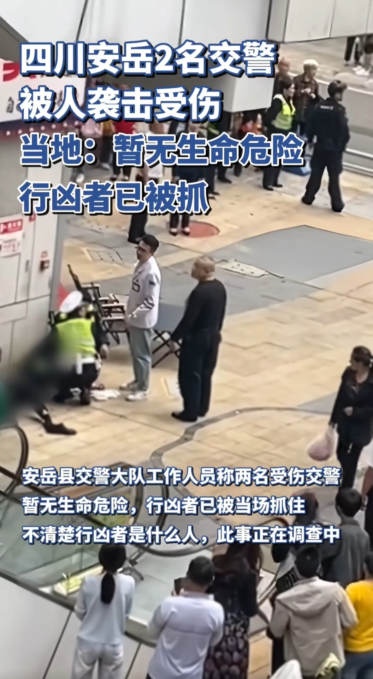 而嫌疑人已被当场制服抓获,安岳县交警大队工作人员称,两名交警送医治疗后,暂无生命危险,目前还不清楚嫌疑人,为什么对交警进行了伤害,事情还在调查中。