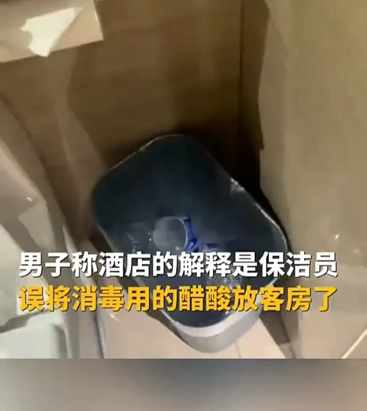 10月16日,湖北武汉一名男子发视频称,自己用酒店房间提供的矿泉水漱口,喝下去后感觉有浓烈的酸味,整个嘴都麻了,经过核查,发现是保洁将消毒用的醋酸装在矿泉水瓶,误当水放在客房。