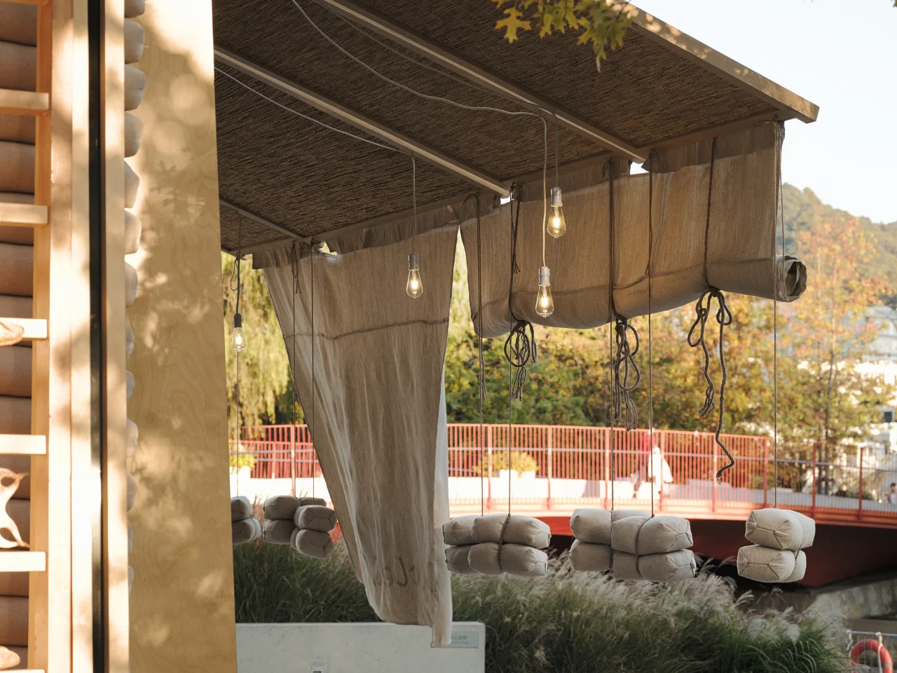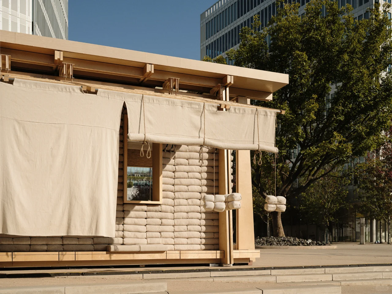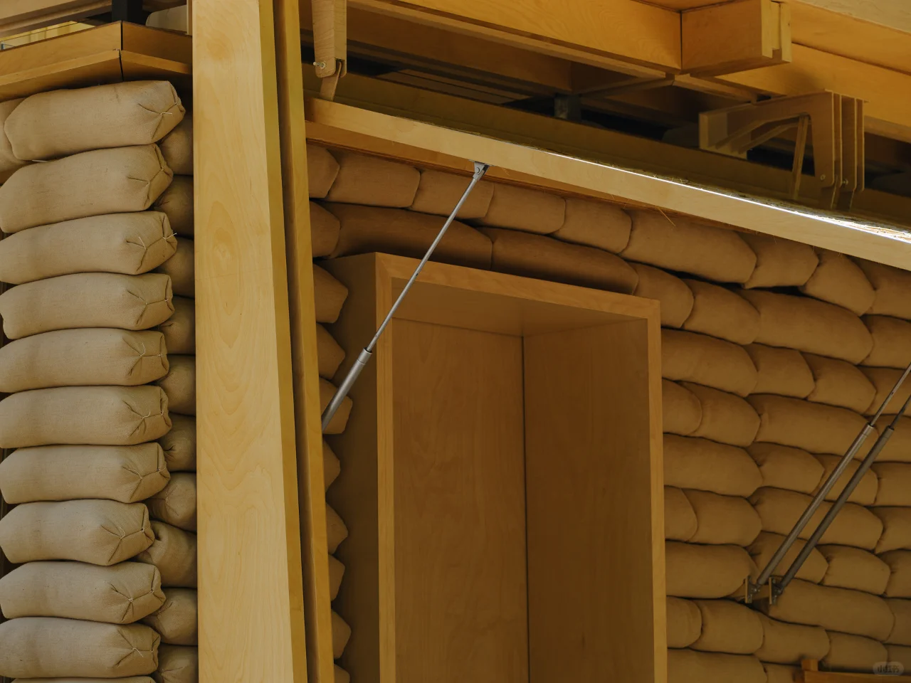 空间底部形成低矮的座位区,灵感来自与大地亲密接触的农民所使用的矮凳,谷物袋立面则用作靠背垫,人们可以根据所需自行调整位置。当遮光板支起、布帘散开,一个半私密空间就此生成了。