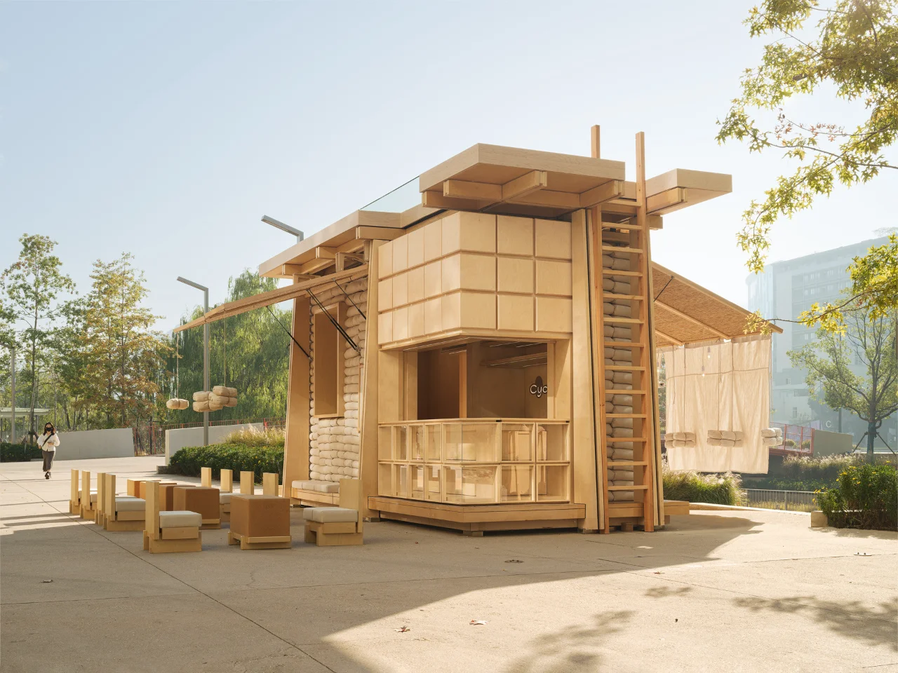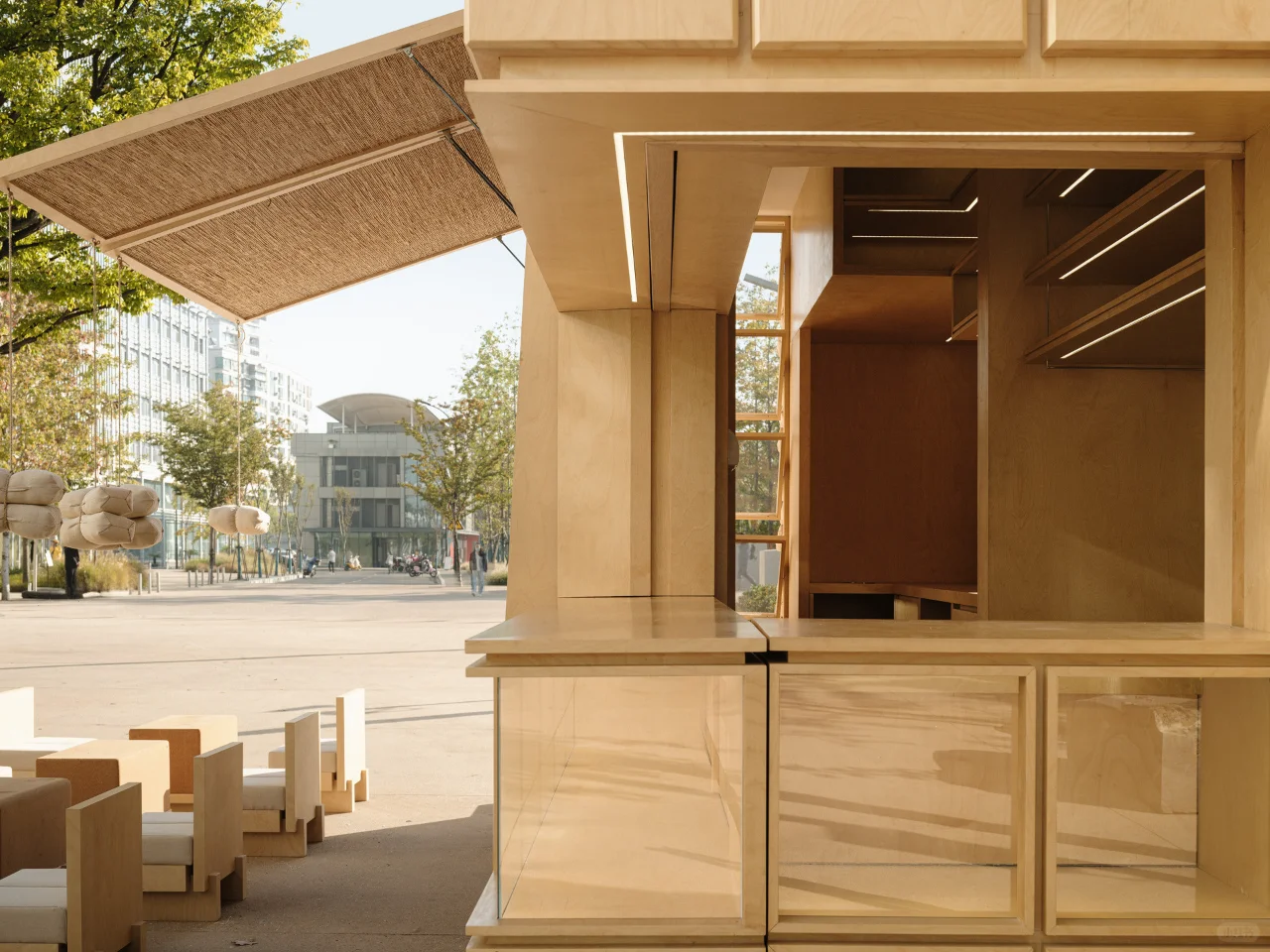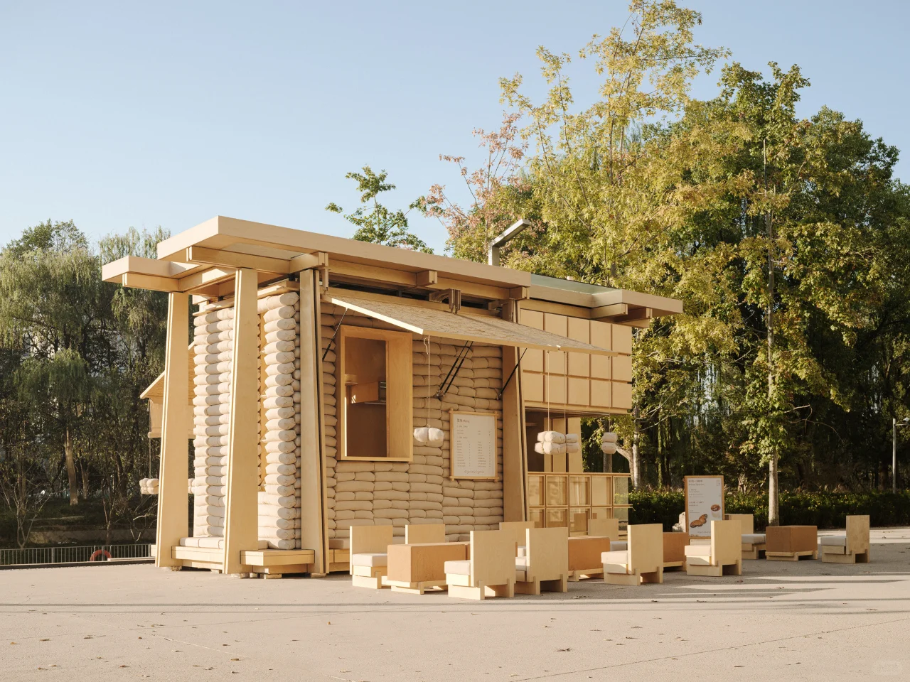 这是一个可移动的面包咖啡快闪店,整个空间以模块化预制木构为主,呈现出一个谷仓的空间形象,延续了农耕文明时期的建筑风格。