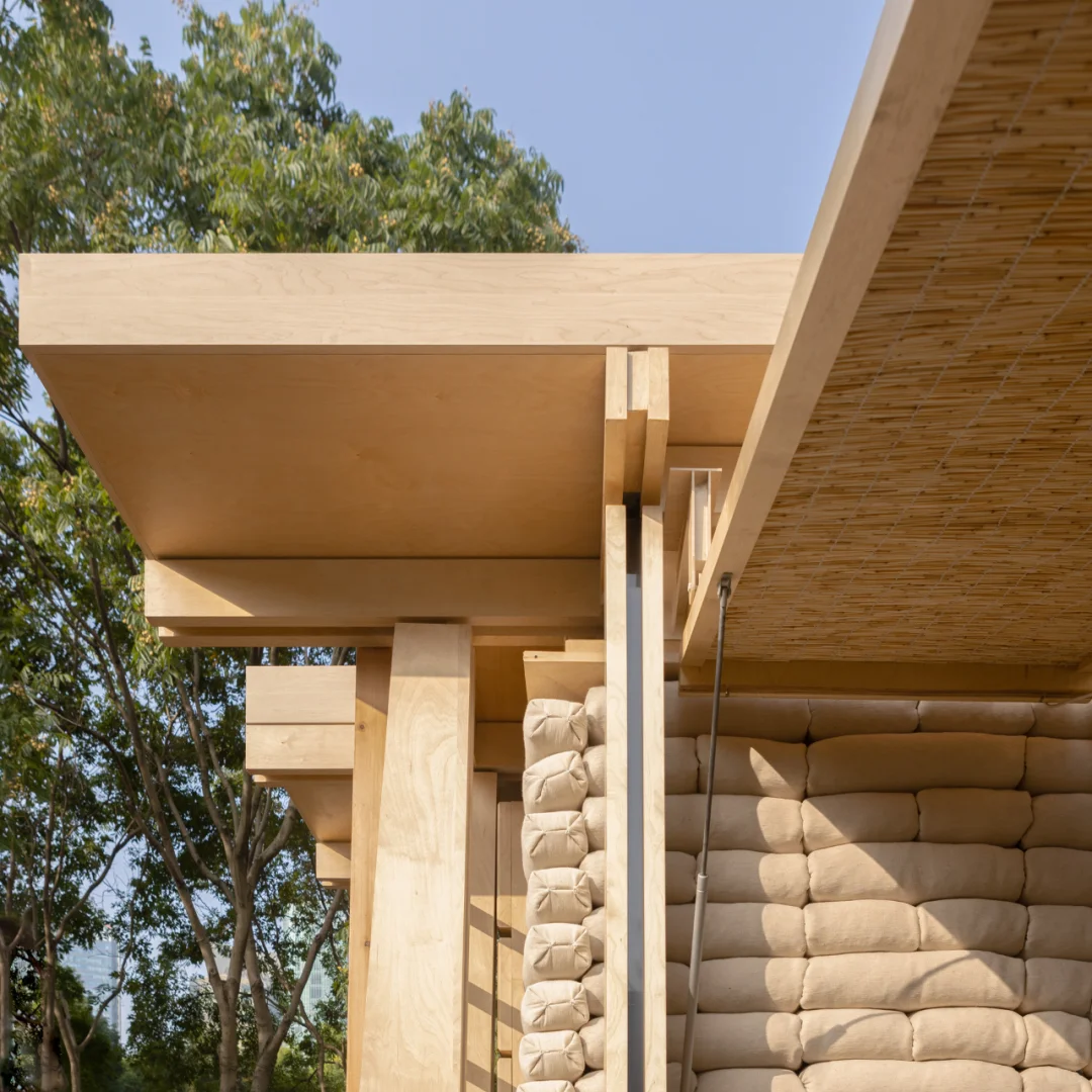 遮阳板位于结构的前方,后方则是防雨顶篷,谷物布袋堆叠在外墙和侧梯上,呈现出砖块的结构感,让人联想到田地里供农民休憩的小草棚。布袋墙设有不同尺寸的细长开口,从外部可以看到制作咖啡、装捡面包的动作,并将自然光引入室内。