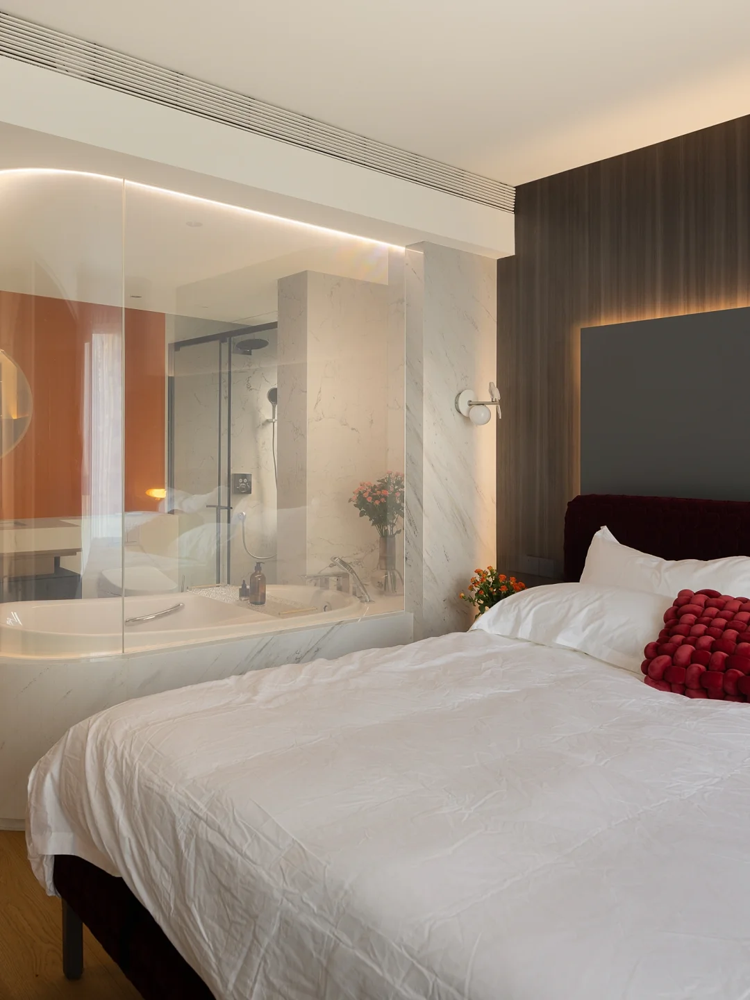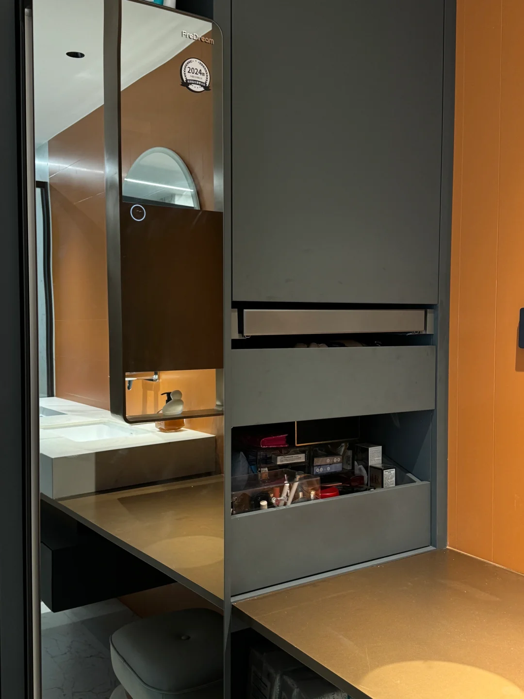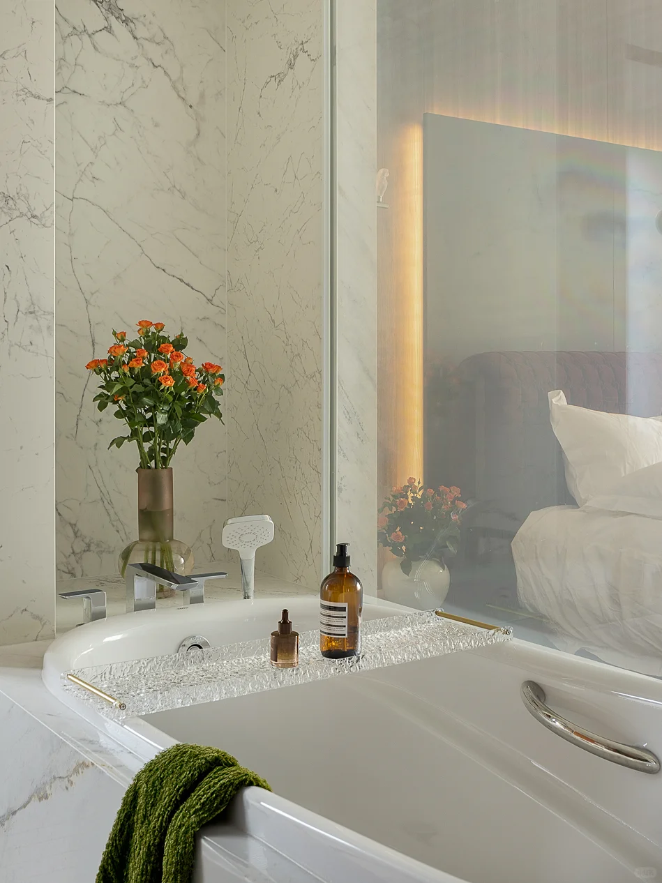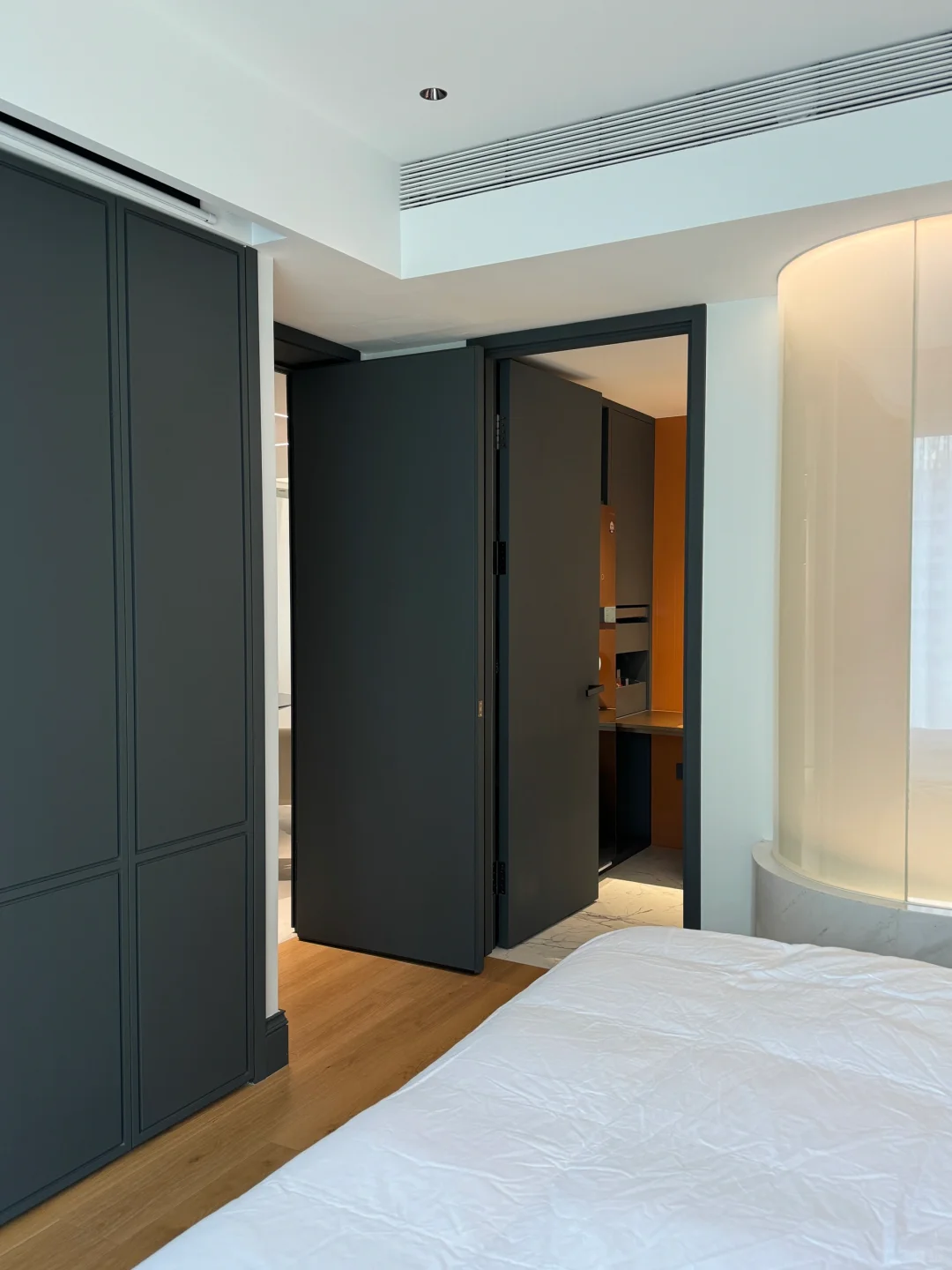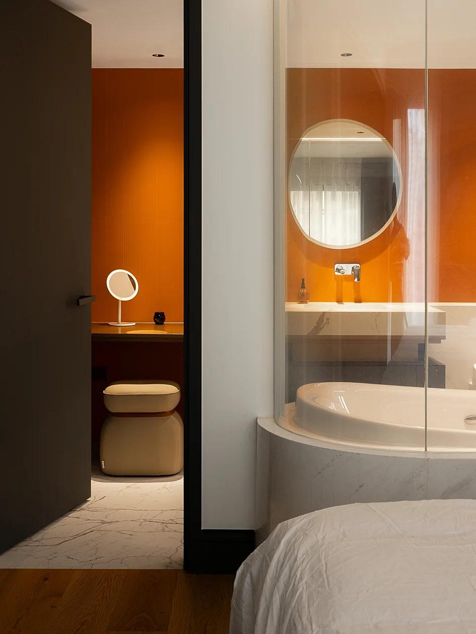 在主卧里隔断出一个爱马仕橙的半透明浴室