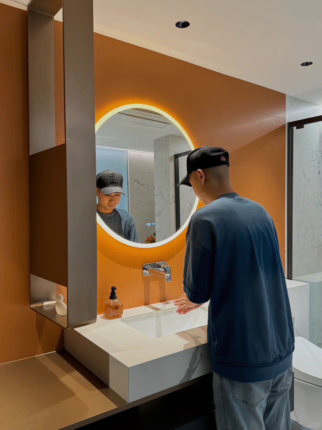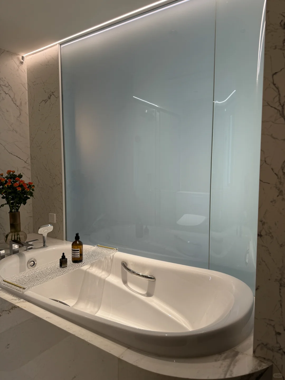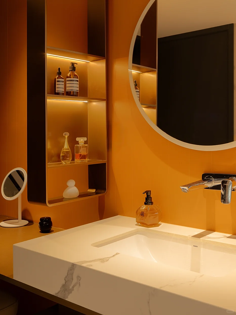 ADDRESS.温州映江锦园 全透明浴室不敢用?半透明浴室刚刚好![赞R] 本案中,我们用整面雾化玻璃代替半墙,沿边摆放浴缸;雾化玻璃控制浴室的“全透明”和“半透明”形态,给主人提供泡澡的最佳享受[派对R]爱马仕橙的活泼色彩让室内摆脱单调,放大高级感,更有活力[哇R]圆形镜面搭配悬空展示架不仅景致也便捷实用。在家体验五星级酒店的快乐,你值得拥有[派对R]