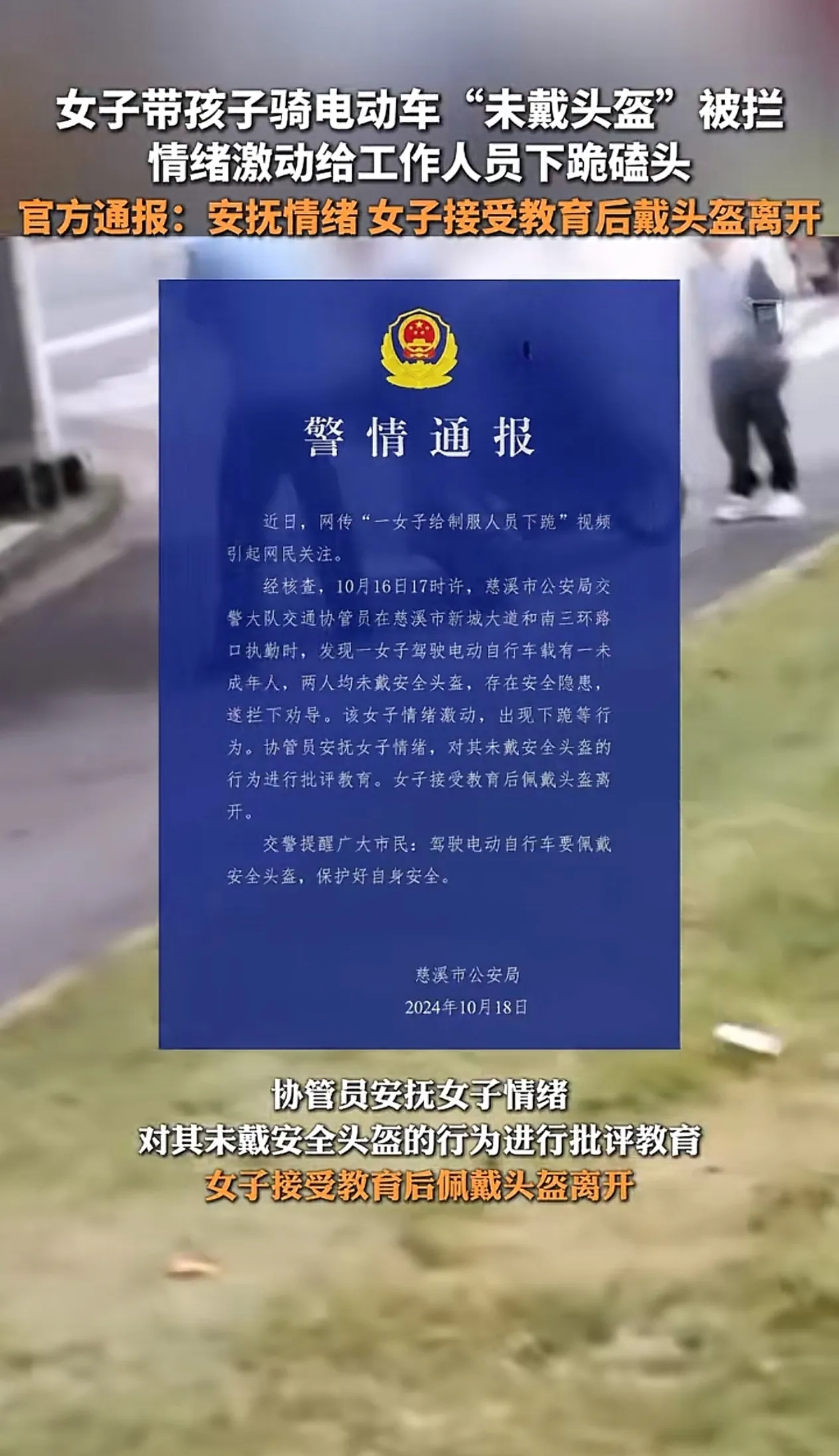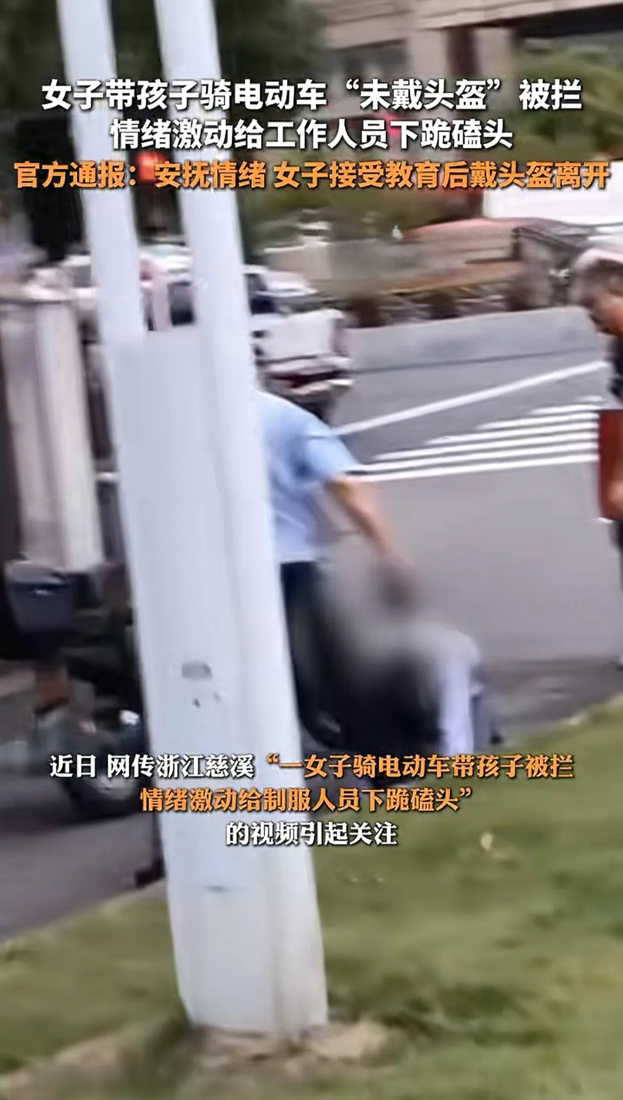 情绪激动给工作人员下跪磕头!今日浙江慈溪一段女子骑电动车带孩子回家,没有戴头盔在路上被蓝色制服人员拦住,情绪激动的向制服人员磕头的视频画面,引起了大量的关注。