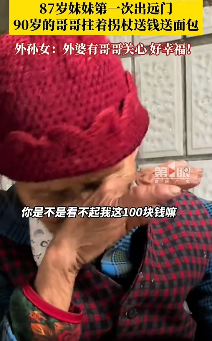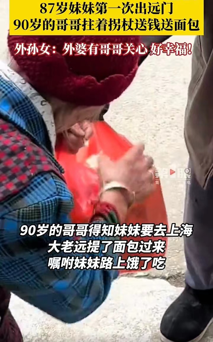 10月14日,湖南一位87岁的奶奶即将出远门,90岁的哥哥得知后,拄着拐杖上门送面包,嘱咐妹妹路上饿了吃,临走时还塞给妹妹一百块钱,遭妹妹婉拒后,哥哥表示:“你是不是看不起我这一百块钱嘛?”妹妹只好收下,满眼不舍地看着哥哥离开。