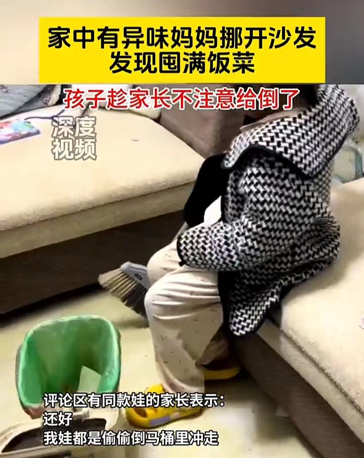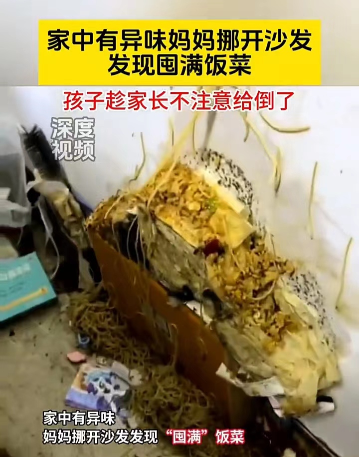 近日,贵州一名女子发现家里忽然散出异味,挪开沙发一看,居然满地都是被孩子倒掉的饭菜。该女子表示,自己辛苦做饭给孩子吃,一不注意就被倒了,已经让孩子打扫干净。