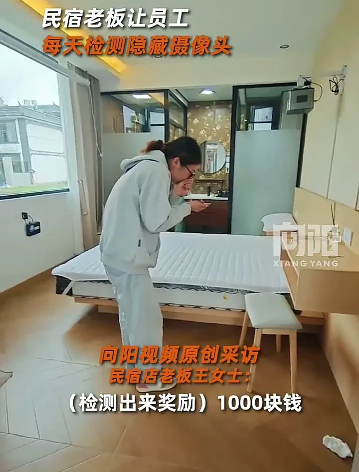 10月18日,云南大理一家民宿内,老板在网上看到其他民宿藏着隐藏摄像头的新闻后,主动买了几个检测仪器,让员工每天进行检测,找出来一个奖励1000元,漏掉一个罚款整月工资,顾客也可以自检。