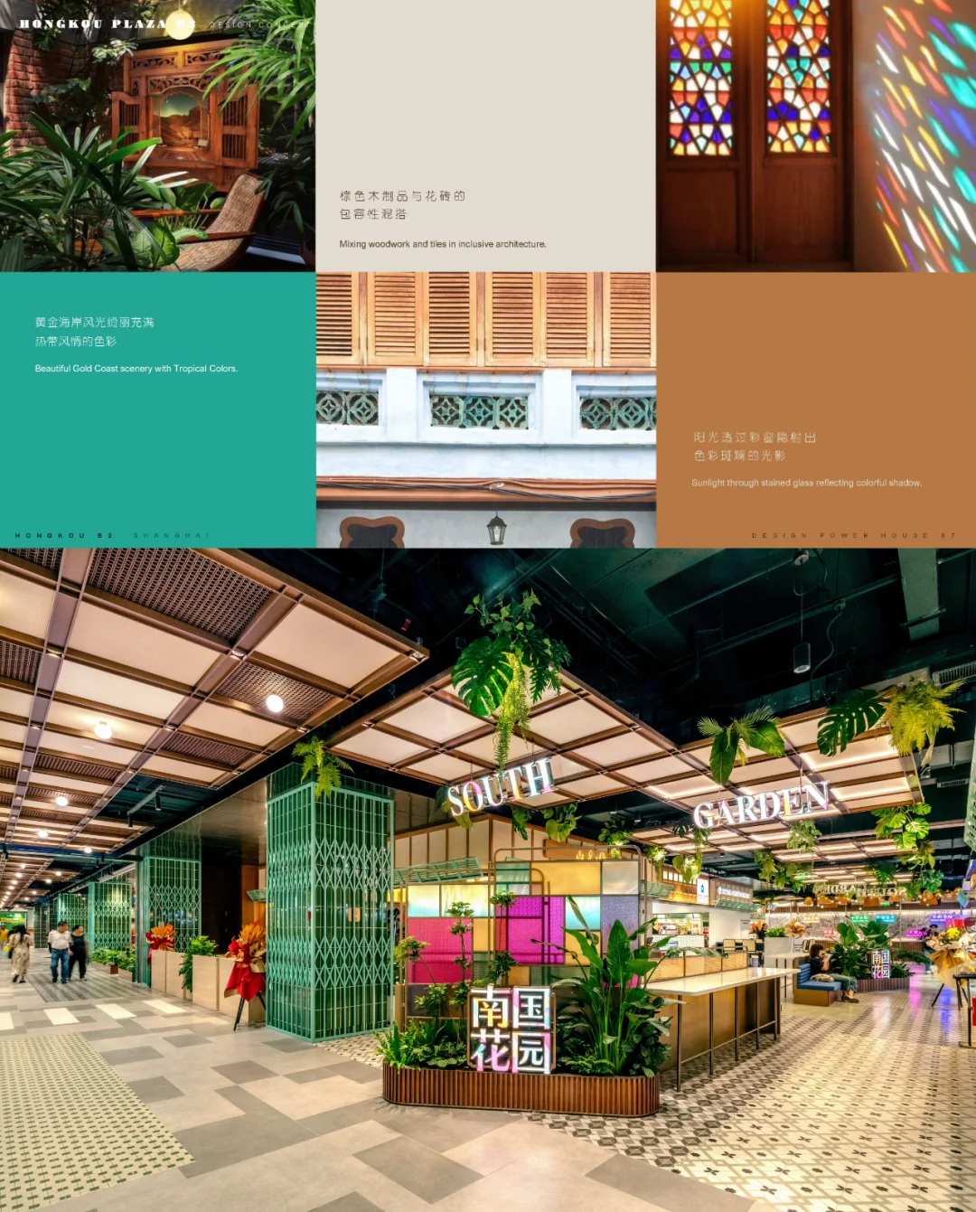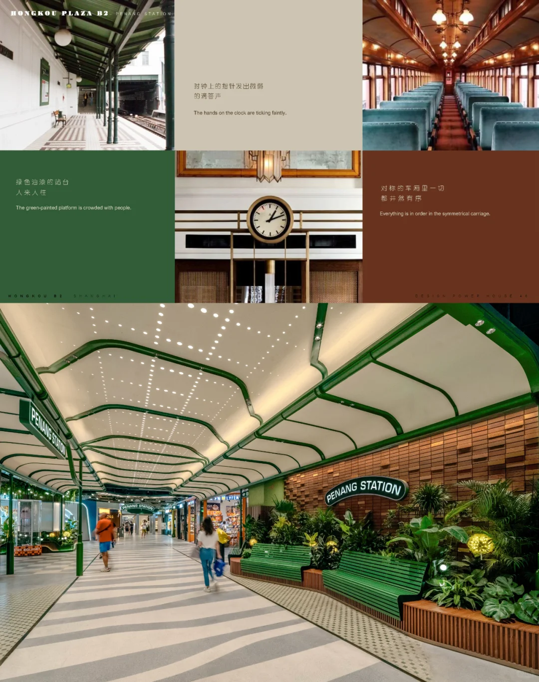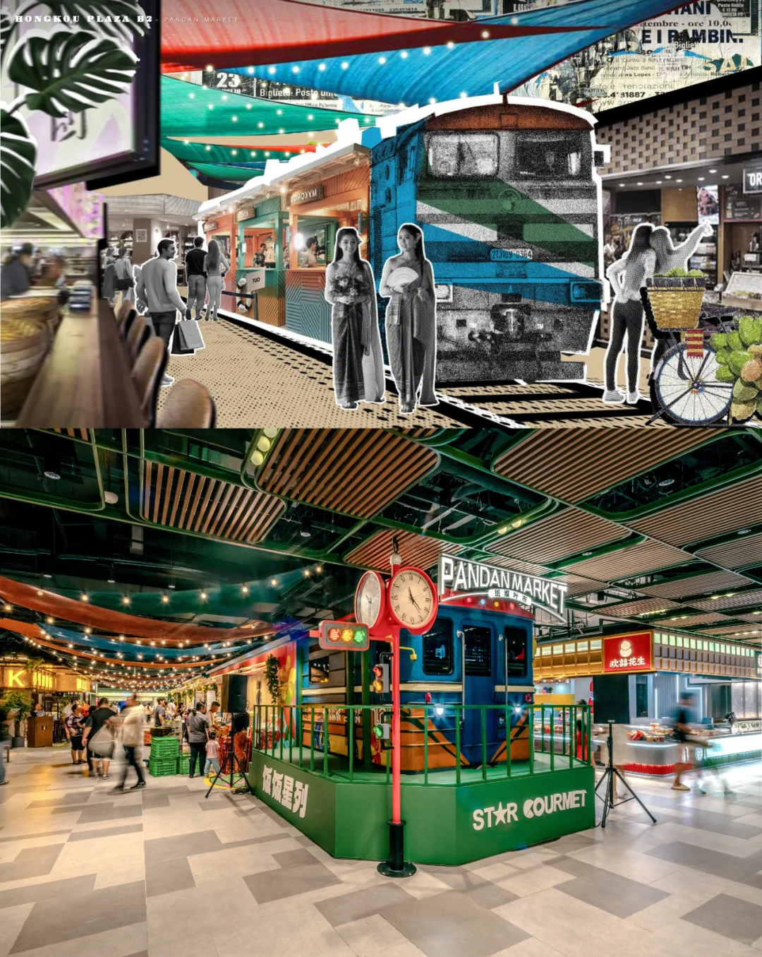 🟩 由DPH设计事务所打造的6600㎡南洋美食街STAR GOURMET,位于上海凯德虹口商业中心B2层。以南洋娘惹的文化记忆为起点,以火车作为串联整个故事线的载体,引领食客穿梭于槟城车站、牛车水街、南国花园、斑斓叶市、咖椰码头及芭乐邮局等各个主题打卡点。 🟩 这里有充满浪漫气息的绿⾊花园,有采用东南亚城市专属色彩与装饰元素的街道,也有还原椰林和棕榈风貌的自然风格,让人仿佛置身于南洋的异国风情之中。