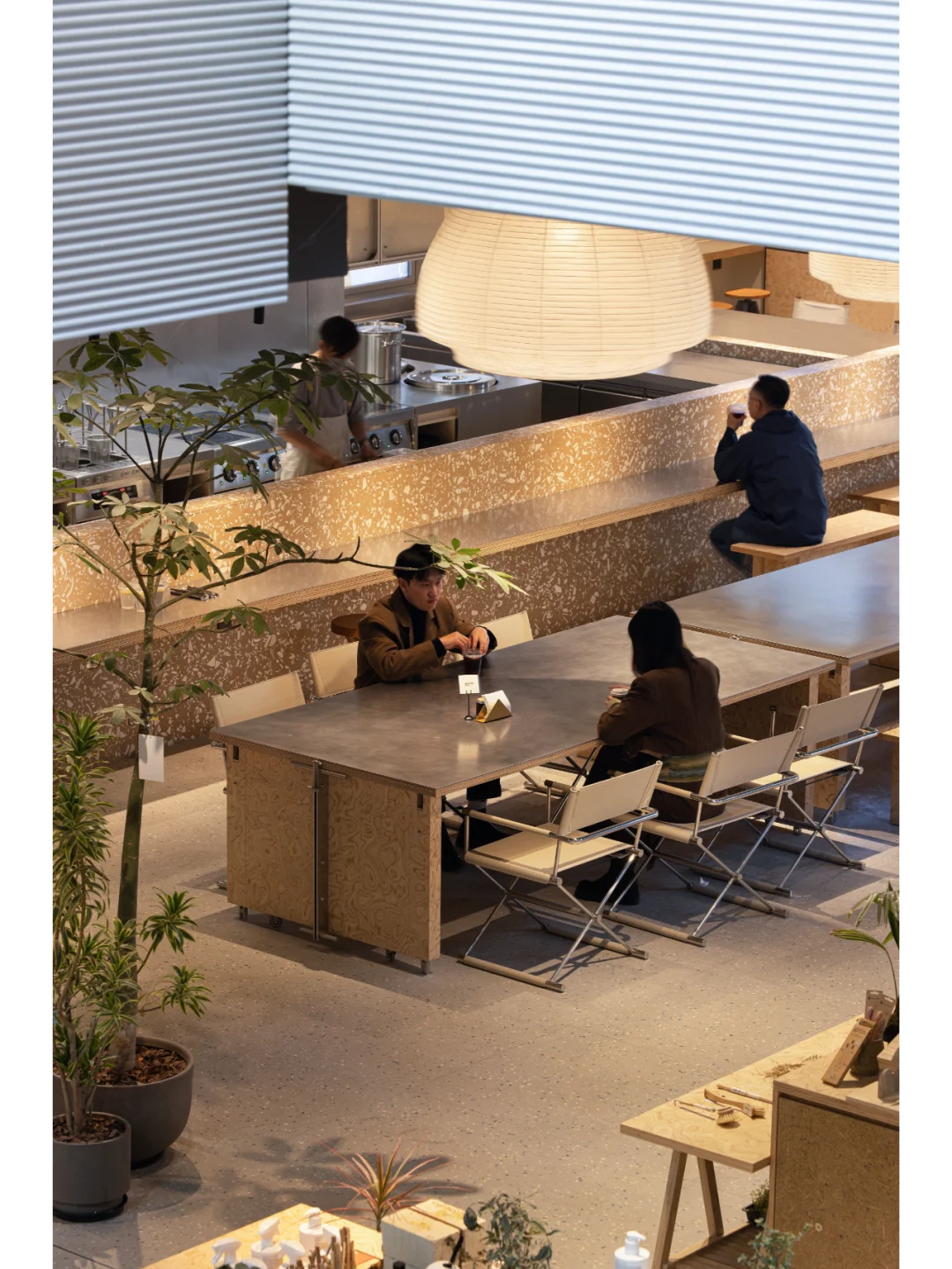 通过中央厨房的设置和运营动线优化的前置,扩大一二层店铺的经营范围,实现开放式厨房观赏性的同时,让顾客与主理人更近距离地充分互动。二层定义为“食物社区”,希望在食物与社群之间架起更多桥梁,利用分时使用的策略,让更多与食物有关的社区活动在这里发生。