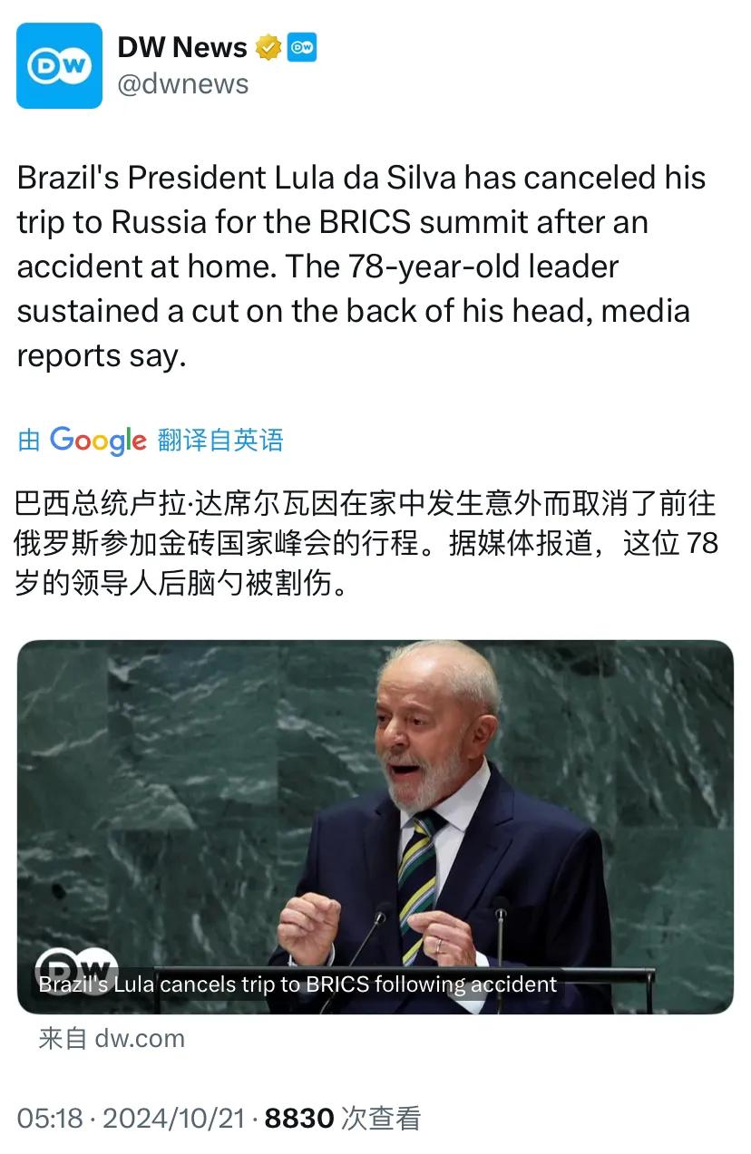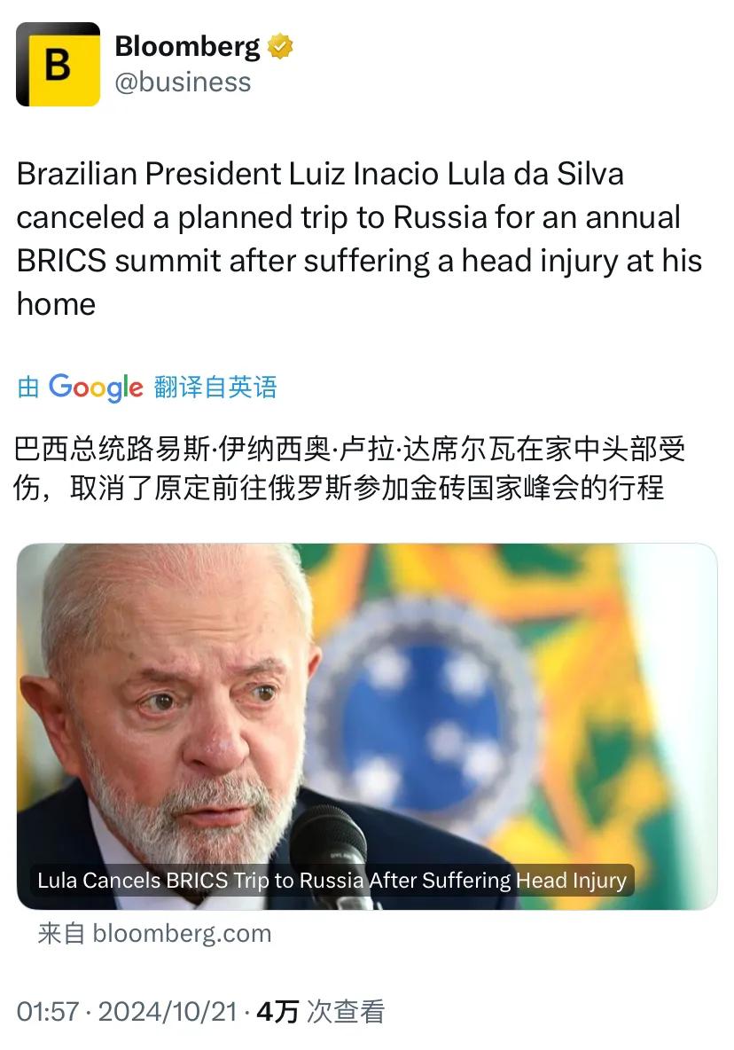 路透社今天(10月21日)报道:“巴西总统卢拉在家中头部受伤并导致轻微脑溢血,因此取消了前往俄罗斯参加金砖国家峰会的行程。”多家外媒也发布了类似报道。(图二和图三) [机智]补充信息:卢拉在浴室里滑倒,摔倒在地板上,头部受到撞击,据卢拉的医生介绍,这次“家庭事故”使他无法前往俄罗斯参加喀山金砖国家峰会。医疗团队建议卢拉避免乘坐飞机,但是允许他进行日常活动。 [机智]评几句:现在关于卢拉是否真的头部受伤,存在不同的声音。有观点认为,这是美国的“分化策略”发挥了作用。卢拉可能以头部受伤为借口,不去俄罗斯参加金砖国家峰会,避免被西方国家批评。也有观点认为,卢拉并没有说谎,俄罗斯喀山金砖国家峰会对于巴西的国家利益也非常重要,尤其是本次会议可能涉及金融合作和“去美元”的相关举措。其实,卢拉要是愿意缠着绷带,以视频的方式与其他金砖国家领导人连线互动,可以打消外部的猜疑。 #卢拉取消参加俄罗斯金砖国家峰会的行程#