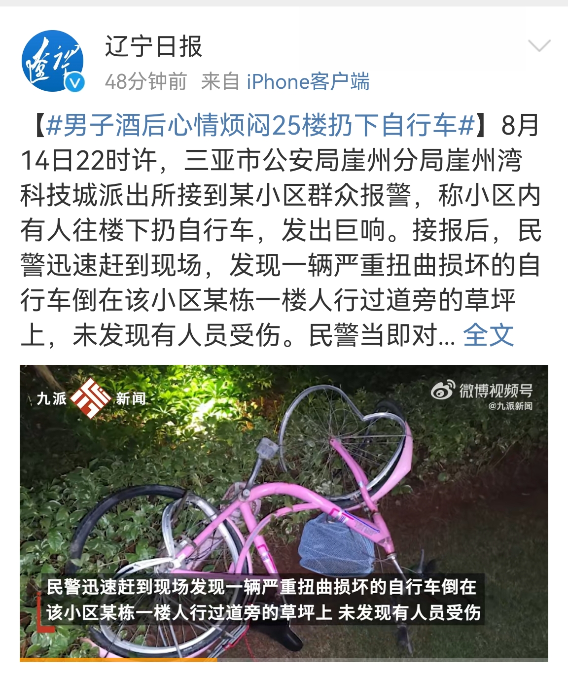 涉嫌高空抛物罪,现在醒酒了,心情也情绪稳定了。#男子酒后心情烦闷25楼扔下自行车#