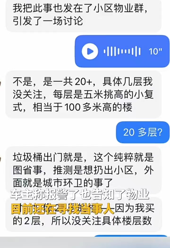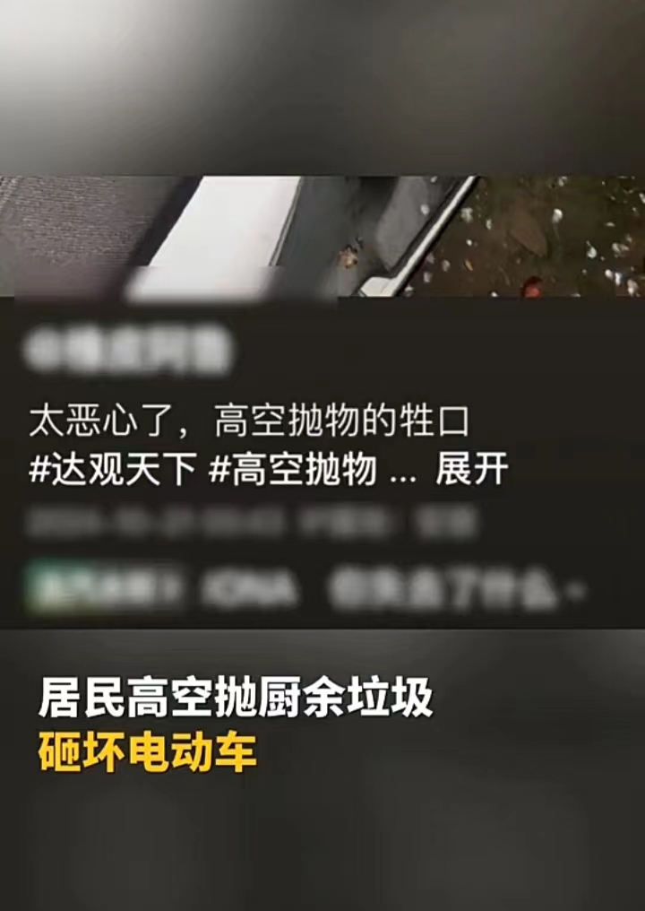 10月21日,安徽马鞍山一名男子发视频称,自己的电动车停在小区外围,谁料被高层住户高空抛物,扔下鱼鳞、内脏等厨余垃圾,导致电动车被损坏。目前已经报警并告知物业,但还未抓到人。