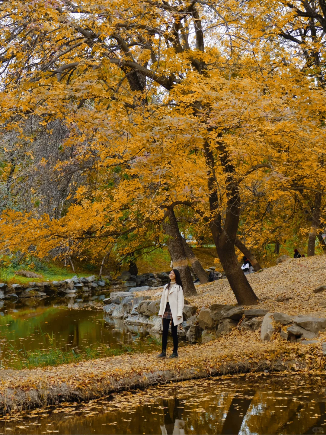黄叶 水边 倒影石头 水中还有锦鲤 芦苇小路