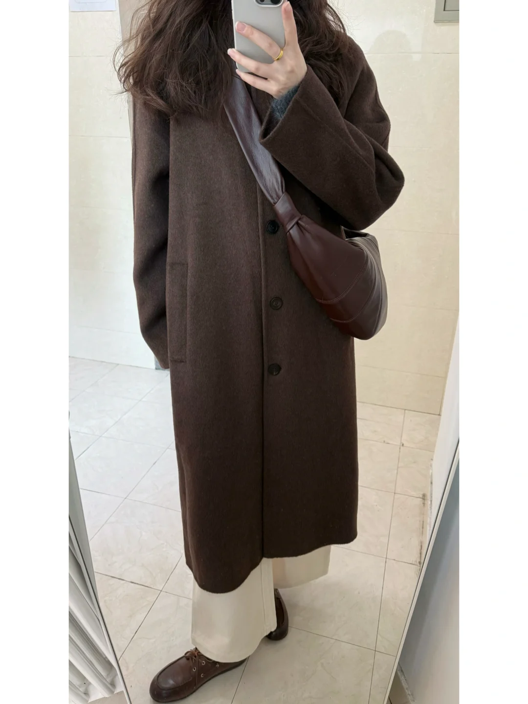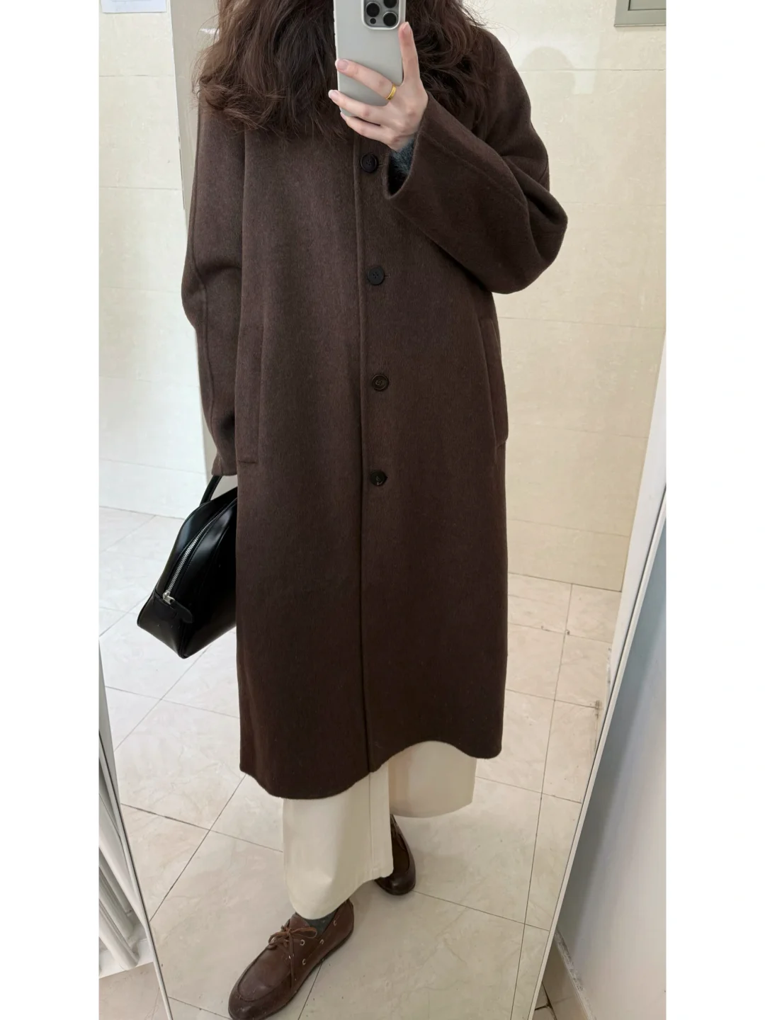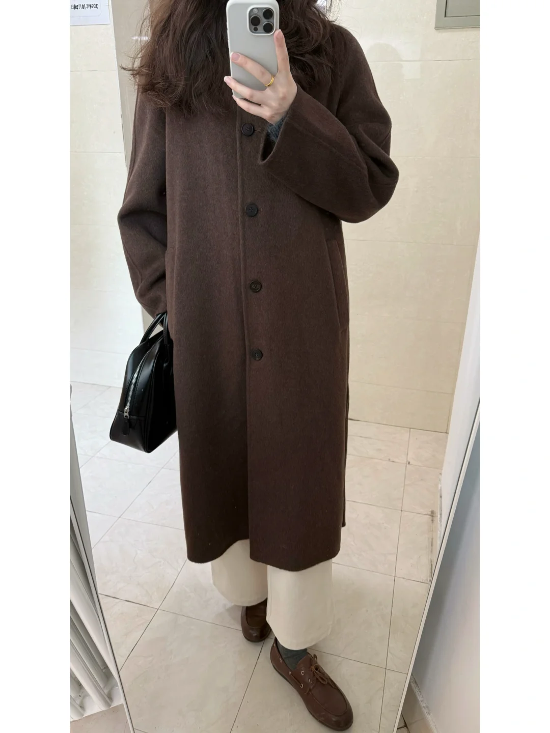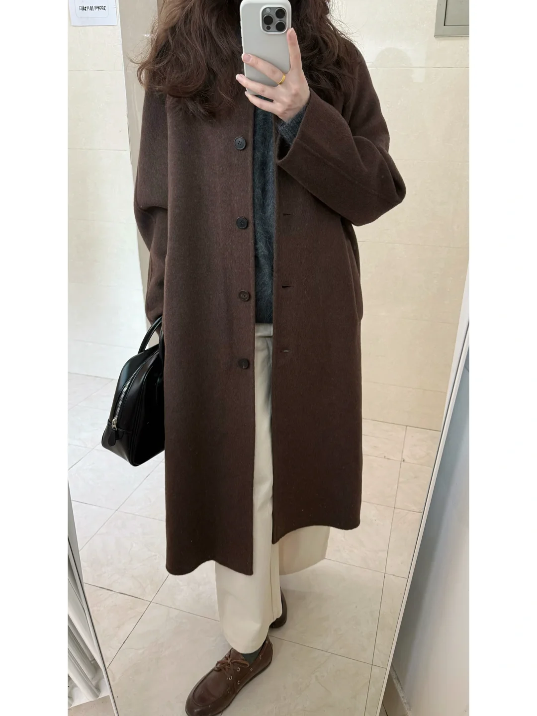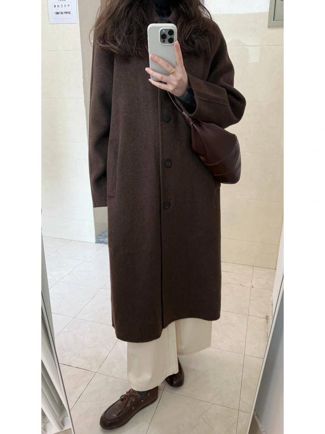 这件颜色非常正 是很浓郁的巧克力棕色 面料是含羊驼绒的 有毛流质感 以及版型真的很经典!