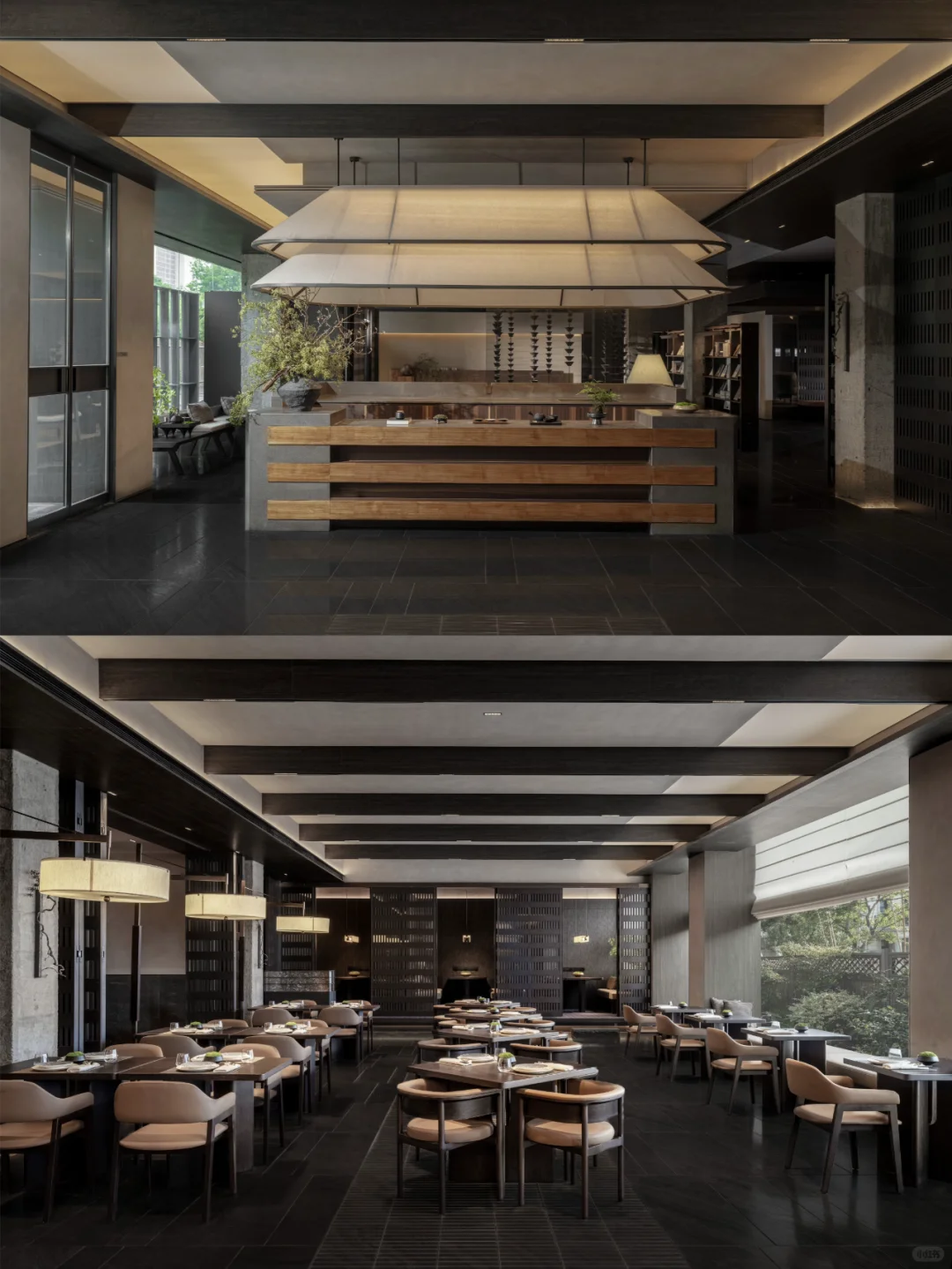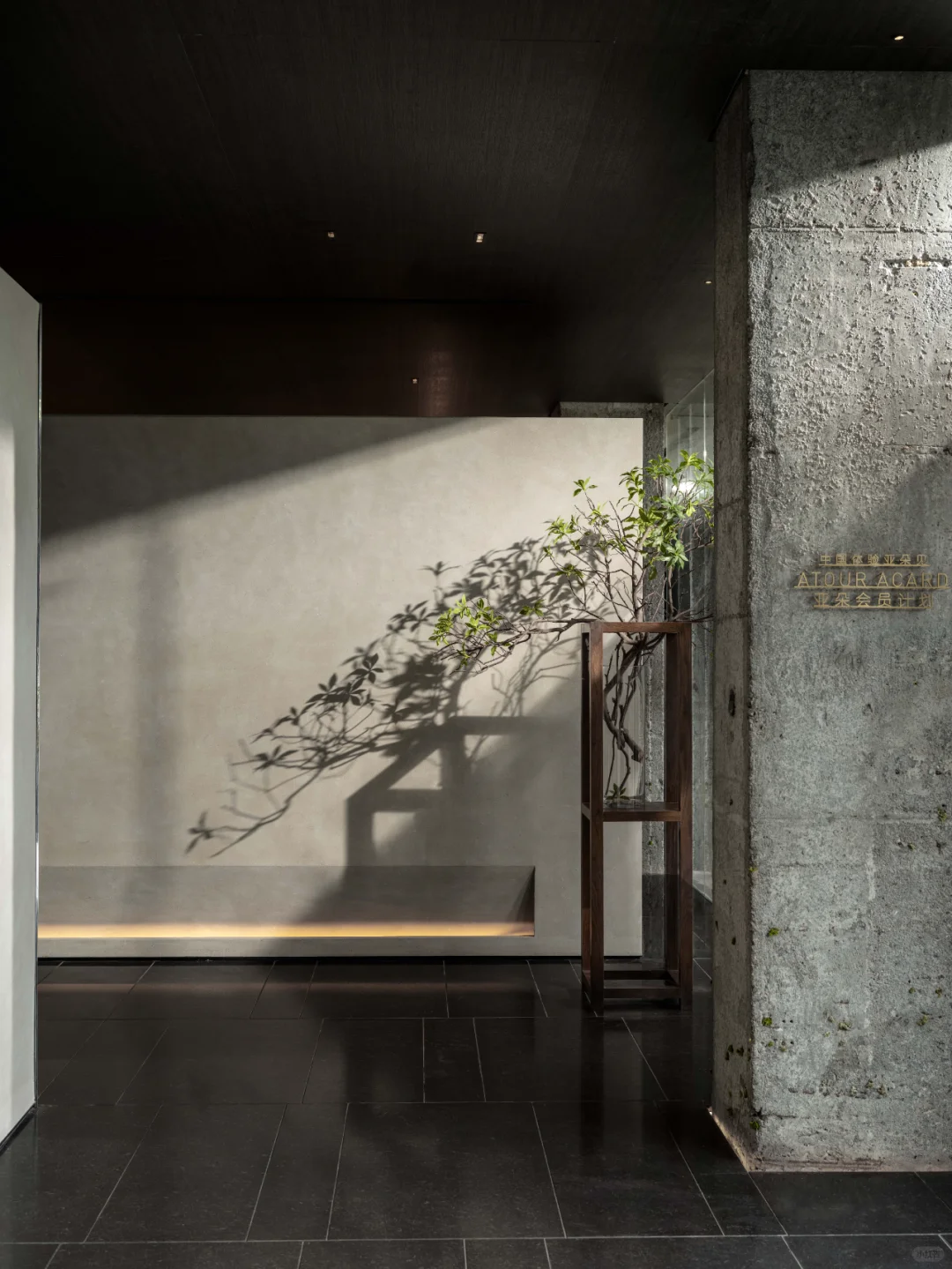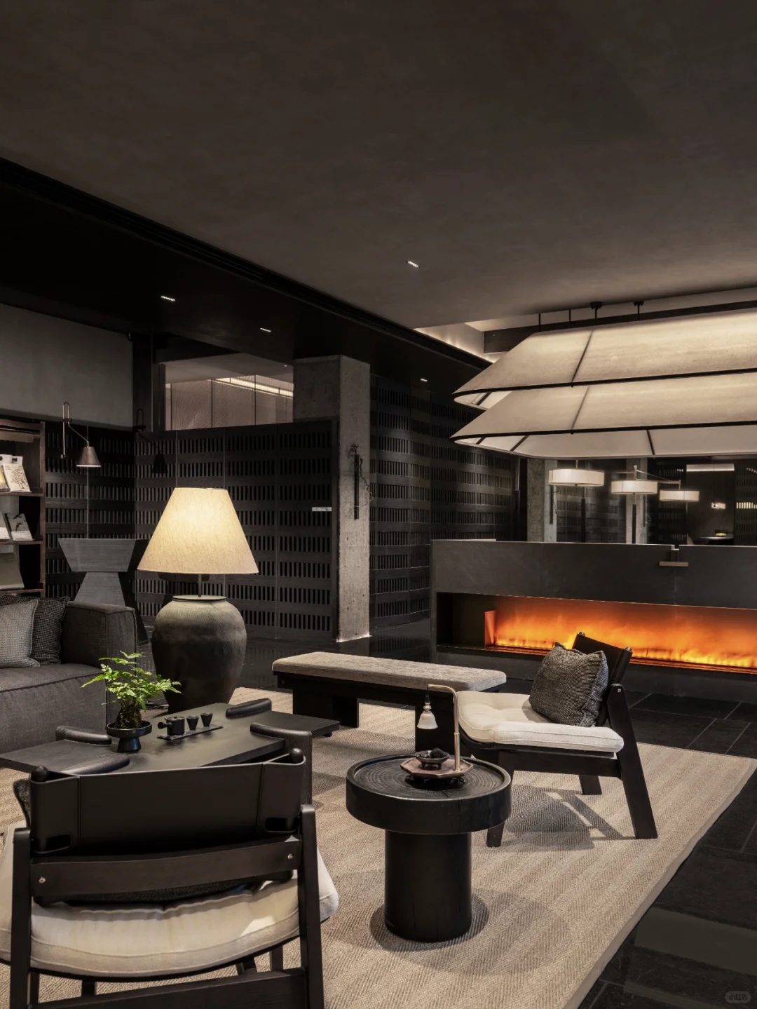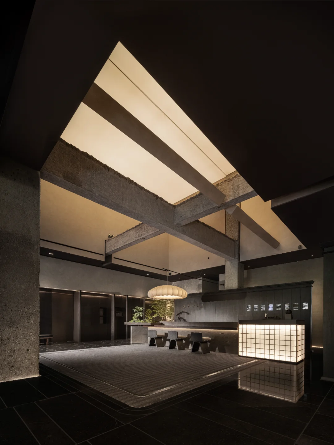 区别与当下都市酒店普遍的立式接待台,萨和设置了度假酒店式的坐式接待台,并融合数字艺术与传统屏风打造服务台背景。以盆景为灵感的服务台和由灯光点亮的奉茶台,空间与体验,相辅相成。