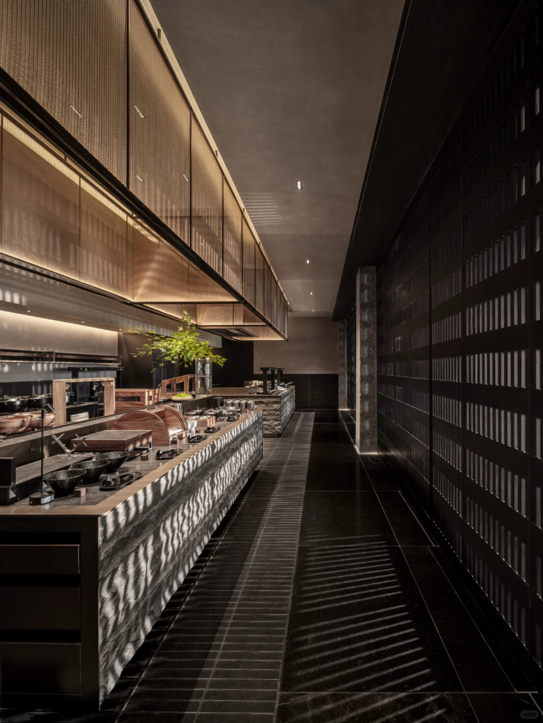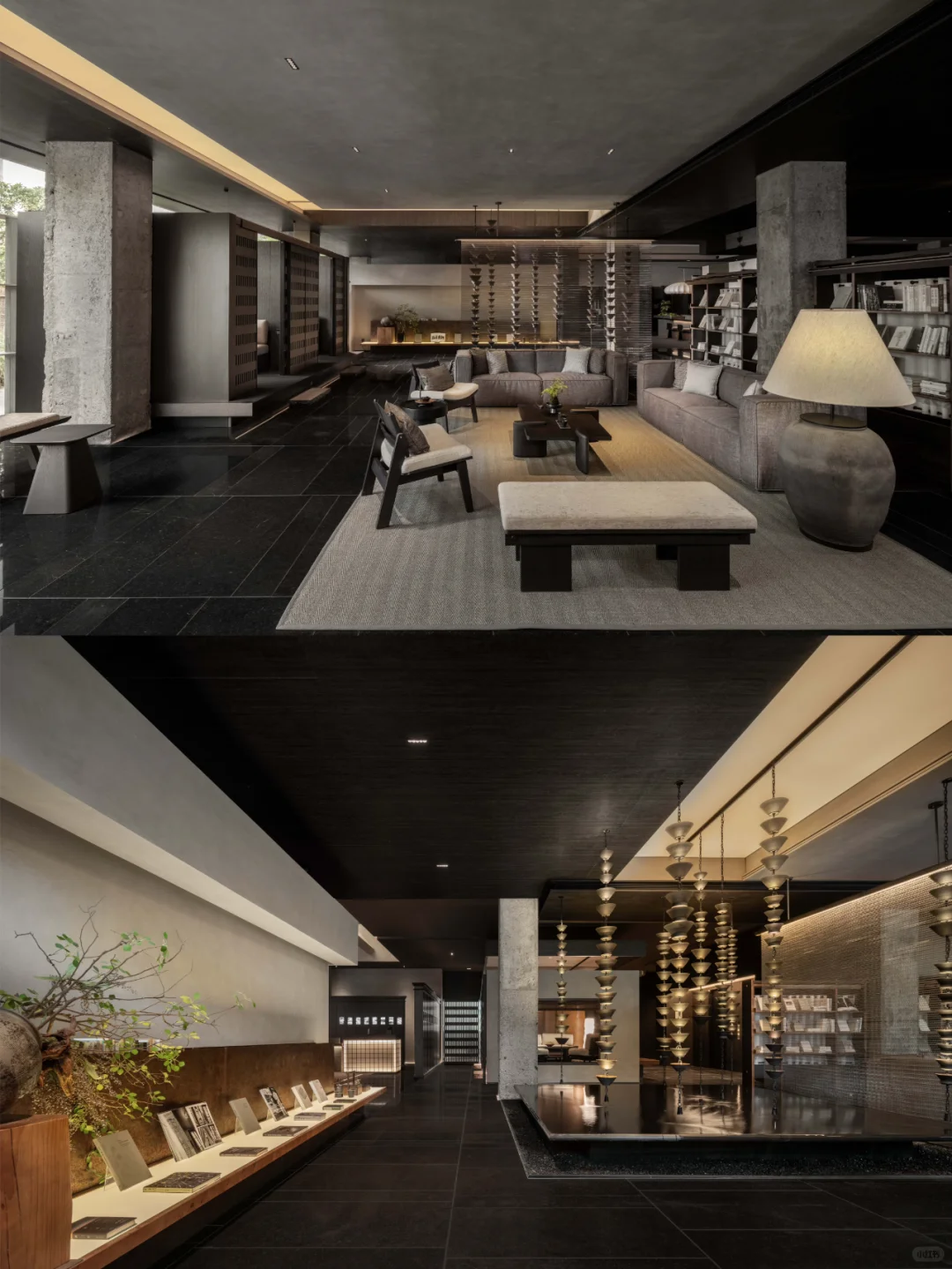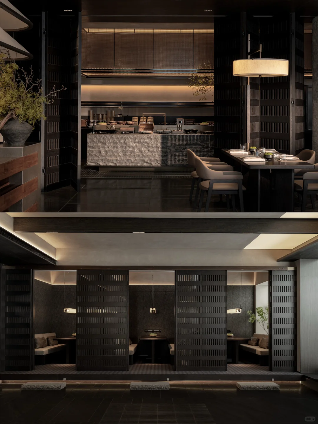 区别与当下都市酒店普遍的立式接待台,萨和设置了度假酒店式的坐式接待台,并融合数字艺术与传统屏风打造服务台背景。以盆景为灵感的服务台和由灯光点亮的奉茶台,空间与体验,相辅相成。