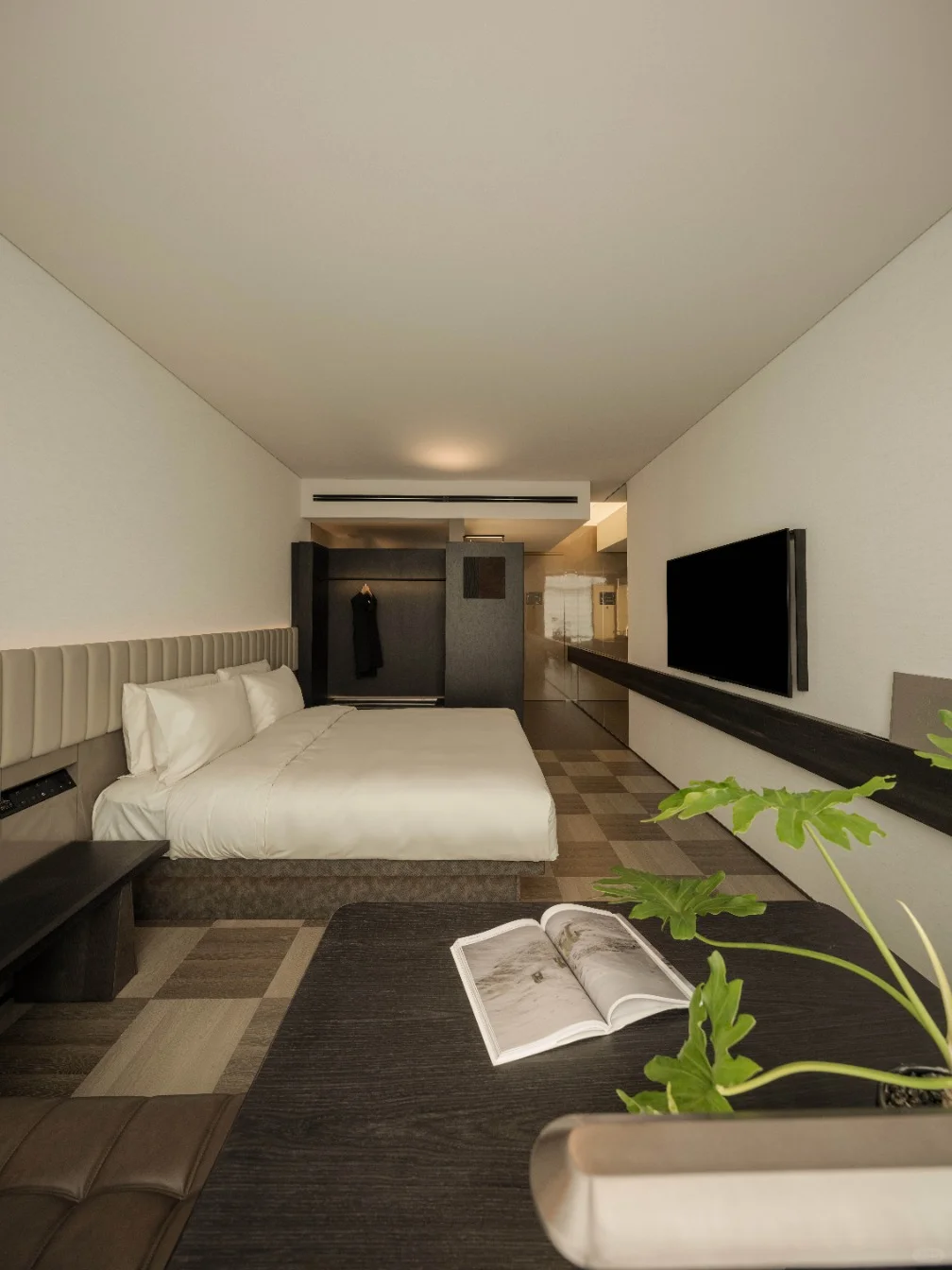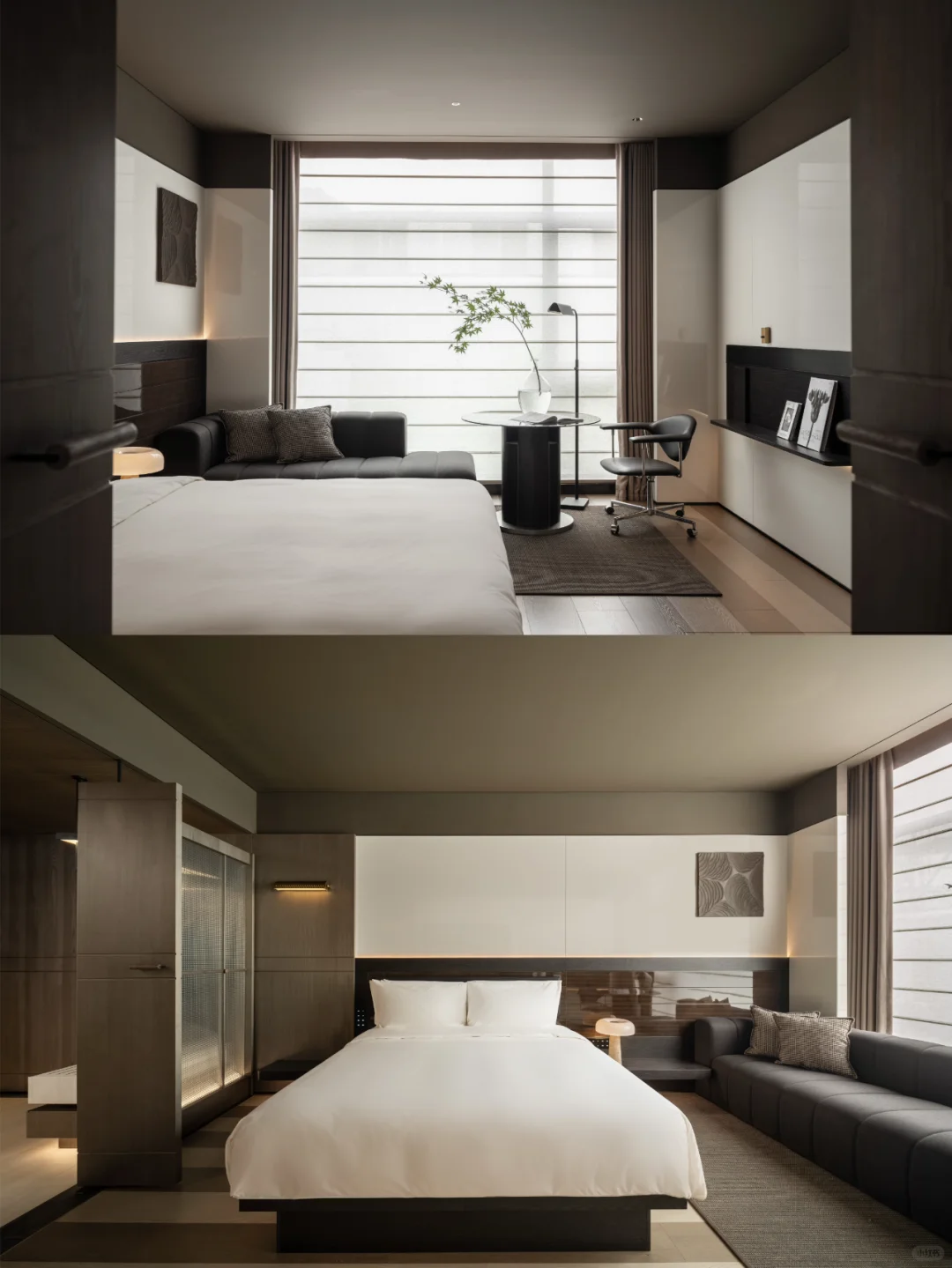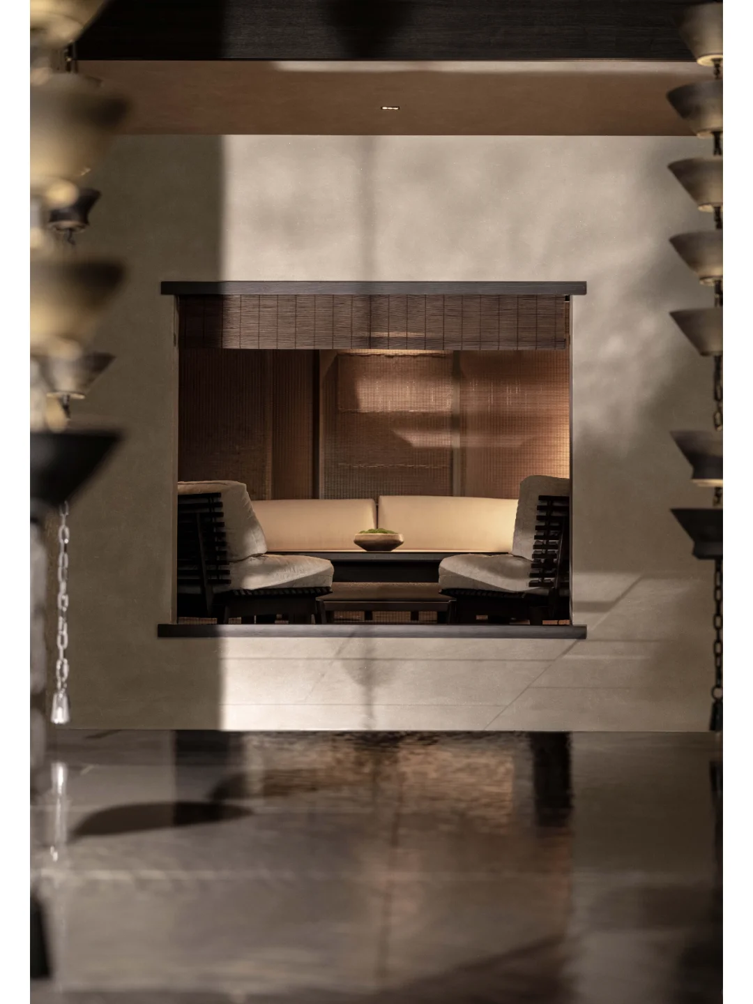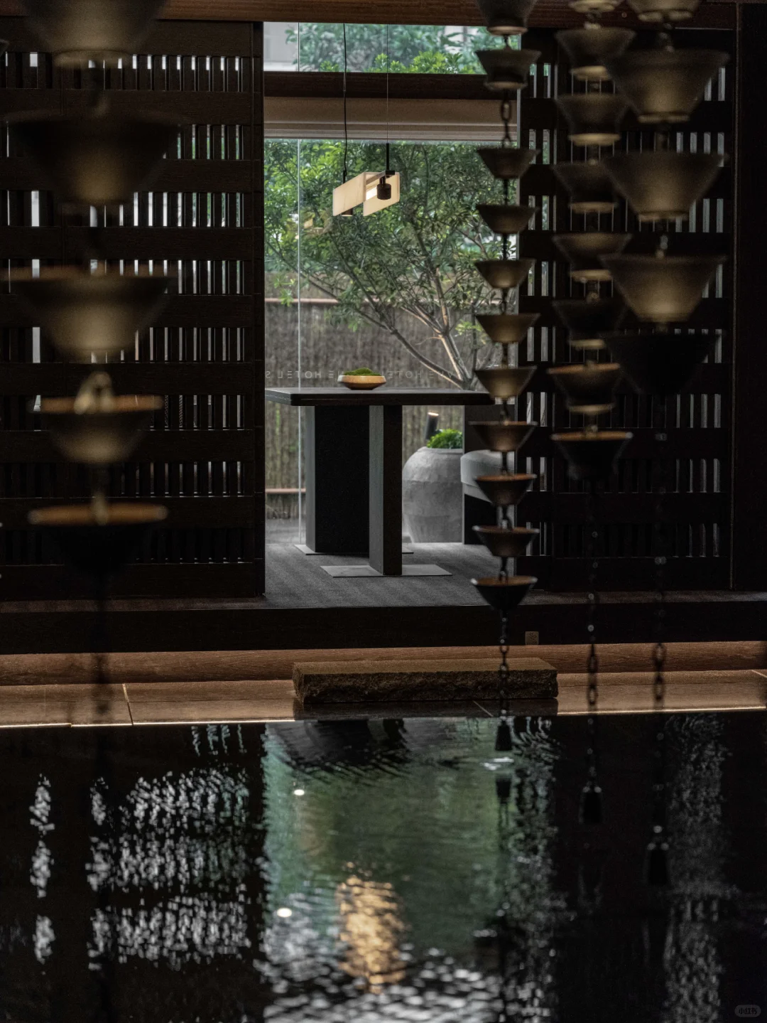区别与当下都市酒店普遍的立式接待台,萨和设置了度假酒店式的坐式接待台,并融合数字艺术与传统屏风打造服务台背景。以盆景为灵感的服务台和由灯光点亮的奉茶台,空间与体验,相辅相成。
