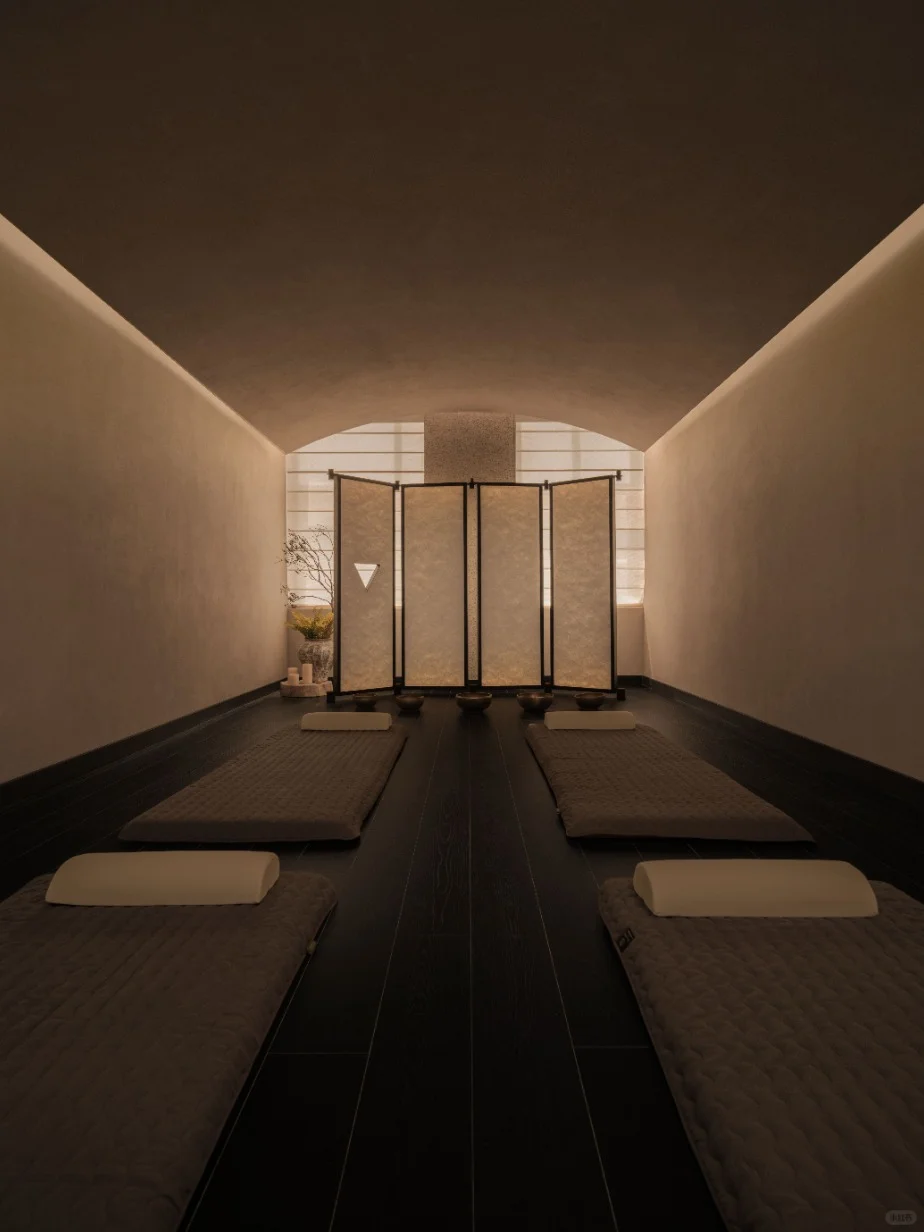 作为衔接餐厅与大堂吧的空间节点,茶吧上覆叠层坡顶的造型天花,与吧台构成了茶亭之感。冥想室以纵向深邃的空间,结合拱形天花,以简约的线条和深色调为基调,营造出一种超脱尘嚣的宁静氛围。