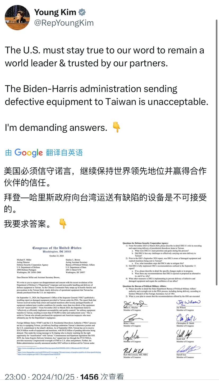 美国共和党籍众议员金映玉(Young Kim)昨晚(北京时间10月25日晚)写道:“美国必须信守诺言,继续保持世界领先地位并赢得合作伙伴的信任。拜登—哈里斯政府向台湾运送有缺陷的设备是不可接受的。我要求答案。 👇” 【金映玉附上了她和其他7位美国议员写给美国国防部安全合作局负责人的质询信。这封质询信提到,截至2024年9月,台湾尚未收到价值242.4亿美元的设备和弹药,其中98.2亿美元的待交付货物被延迟。此外,台湾收到了发霉的防弹衣和过期的弹药,超过三分之二的设备“无法使用”……】 [机智]评几句:台湾一直以来都是美国军工复合体的冤大头。价格虚高、质量堪忧、交付延迟等问题屡屡出现。美国军工企业供货的优先对象是以色列和中东地区的大金主,台湾每次都是被拖延的对象。其实金映玉说的这些问题,买卖双方都知道,这只是交“保护费”的一种方式。这位韩裔美国人金映玉,大家可能也不陌生了,她是美国众议院外交事务委员会亚太小组主席。美国众议院涉华的多项法案,她要么是起草人,要么是共同提案人。
