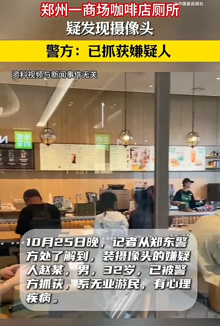 近日,河南郑州一名女子发视频称,自己在星巴克一家门店厕所内,发现通风口处隐藏着摄像头。事后她告知店员并报警,警方通过调查很快抓到嫌疑人,是一个32岁的无业男子,患有心理疾病。