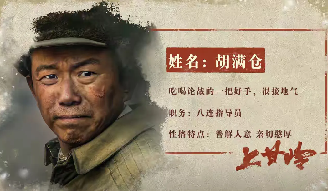 《上甘岭》最没想到的是,演技、人设最无争议的,竟是一个小品演员潘斌龙、饰演的八连指导员胡满仓,他以吃喝论战,特别符合一个军中长期转战一线的基层指导员形象,人设稳不浮夸,人物乐观接地气,尤其在他牺牲时说的我吃好了该下桌了,看哭了屏幕前的众人。