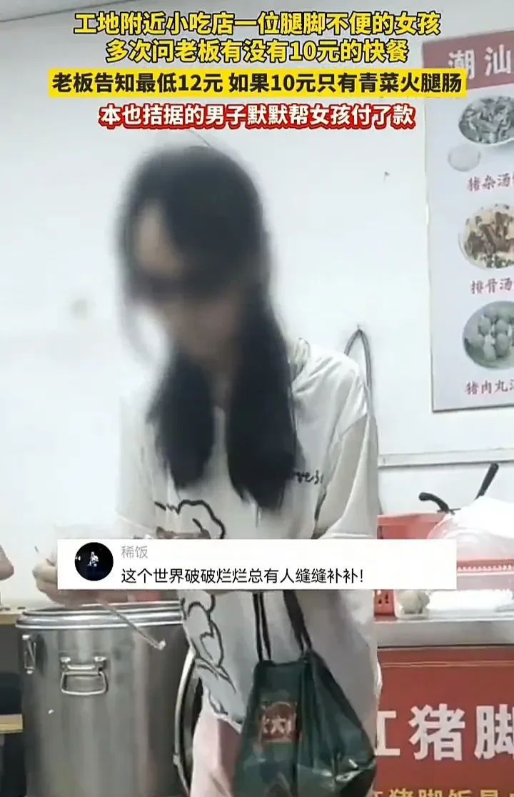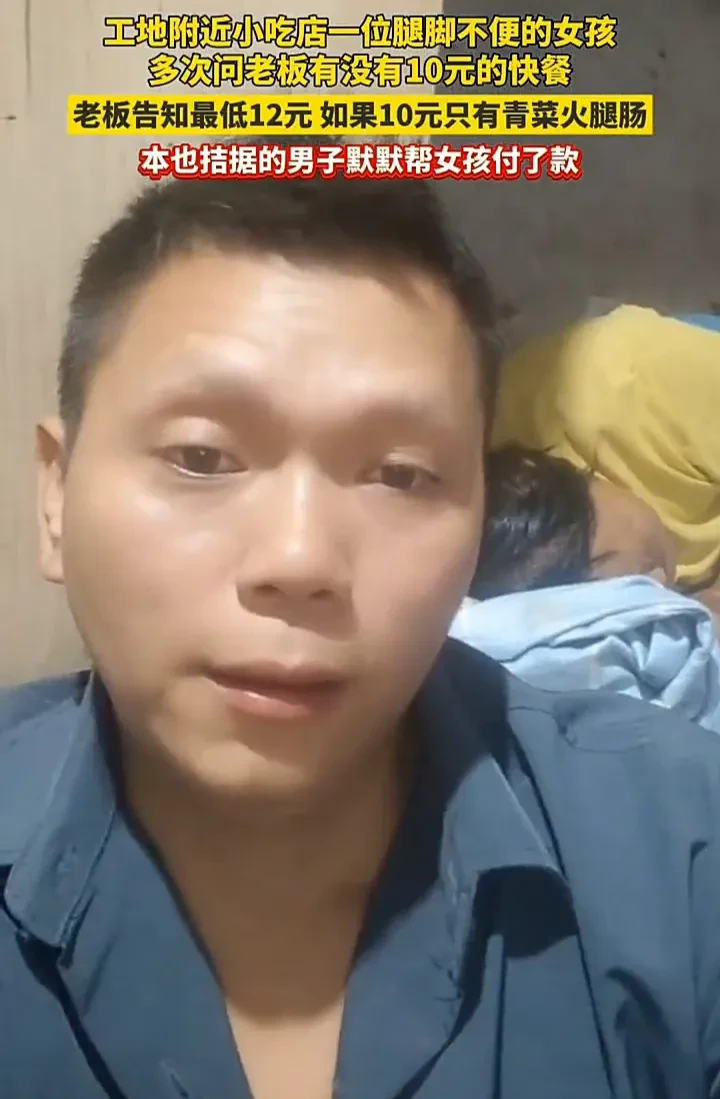 10月26日,广东一名网友发视频称,在工地附近的小吃店,有一位腿脚不便的女孩多次询问老板有没有10元的套餐,老板告知最低12元,一个陌生男子见状,本也拮据的他默默帮女孩付了账。