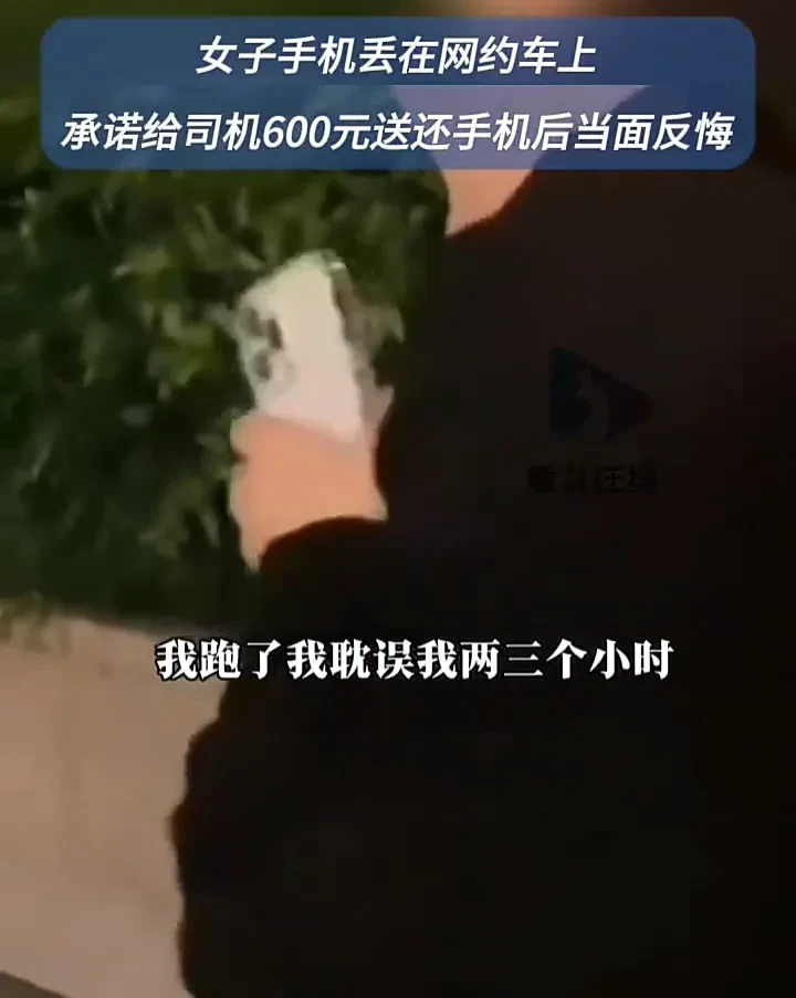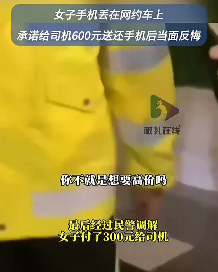 10月26日,上海一名女子不慎把手机丢在网约车上,随即联系司机承诺给600元送回,但司机跑五六十公里送回后,女子却直接反悔,一分都不给。最后经民警调解,给了司机300元。