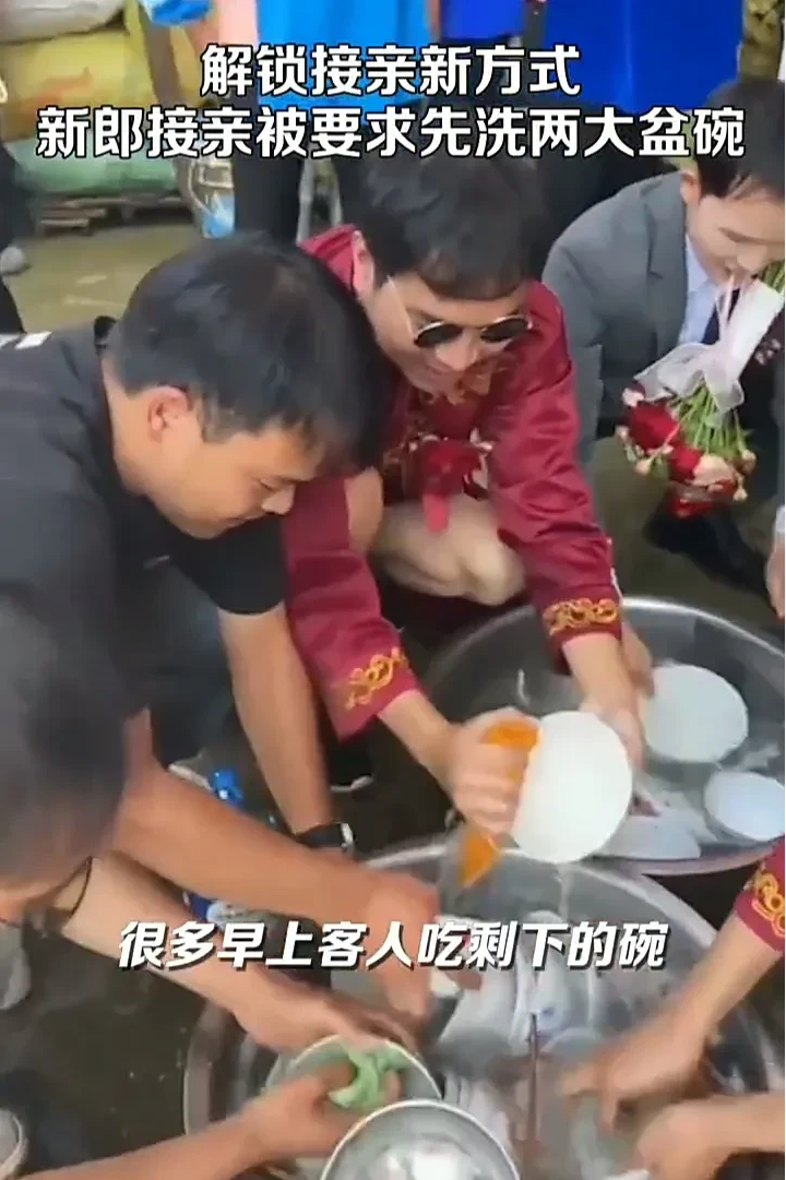 看到这名男子带着伴郎团在新娘家洗碗的画面,真的令人感到无奈。新娘家里设置接亲障碍可以理解,是为了活跃喜庆的氛围,不过让新郎和伴郎洗碗,这种方式确实不太合适,毕竟新郎是盛装打扮才过来的,这样的做法会显得比较狼狈。大家怎么看呢?