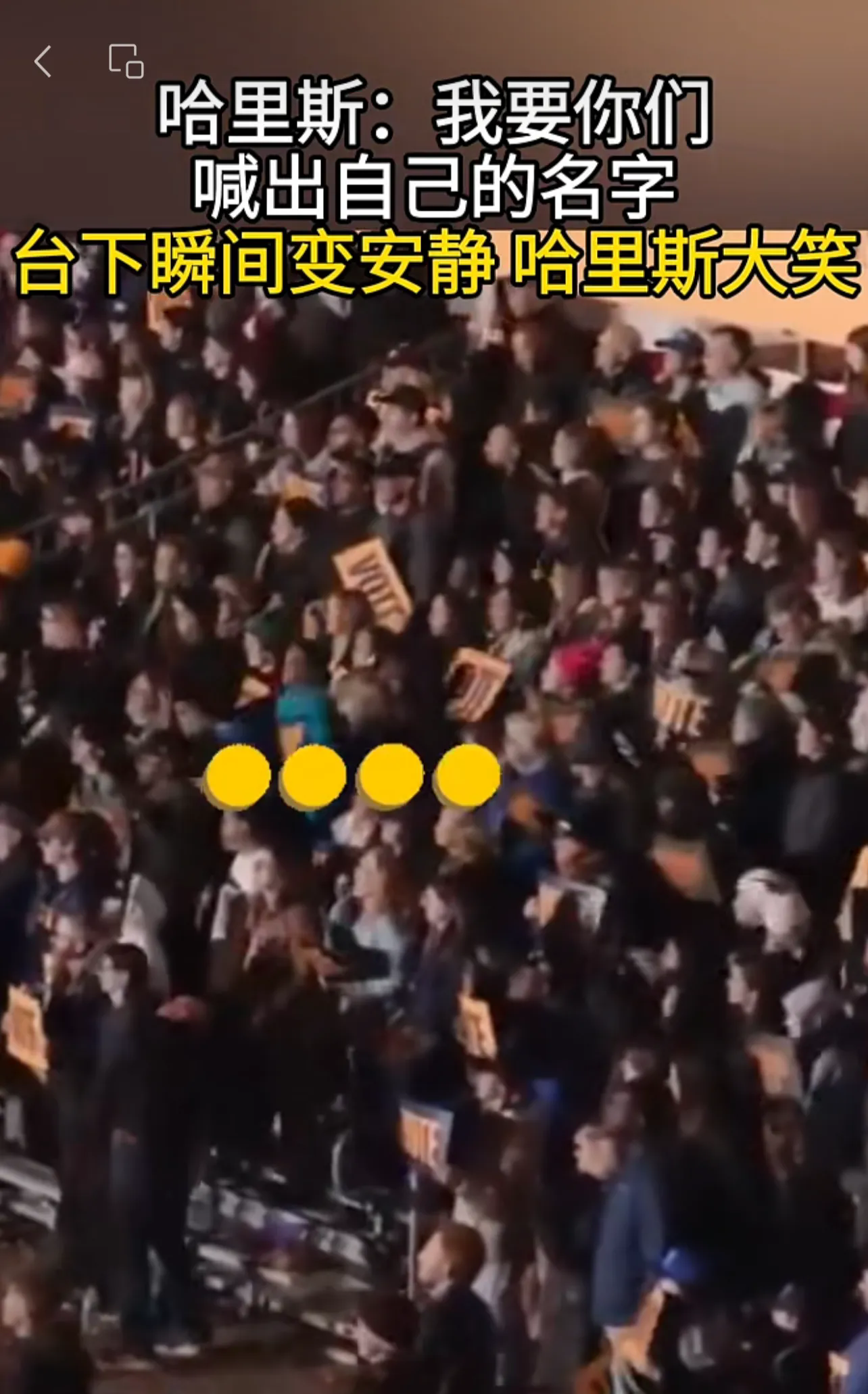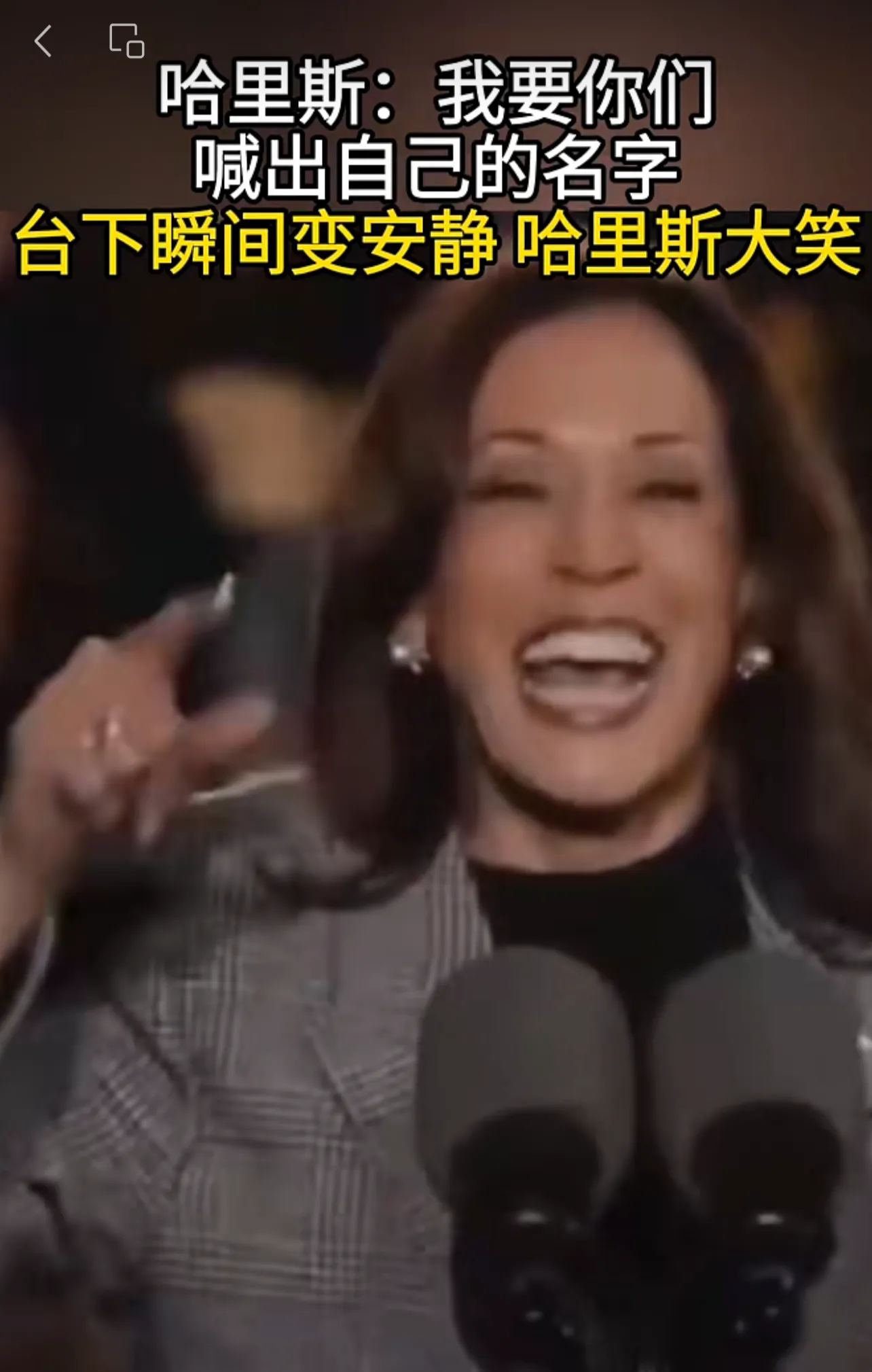哈里斯只能尴尬哈哈哈…… 哈里斯站在台上, 自信且激动, 以为台下会回应自己, 没想到场面一度非常尴尬, 拜登都不敢这么玩, 她倒是自己嗨起来了。 哈里斯:“我要你们喊出自己的名字” 观众:......(不会是个傻子吧) 哈里斯:哈哈哈哈哈哈