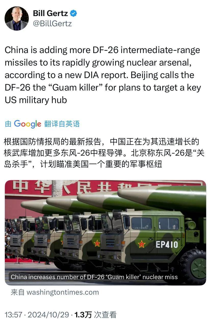 华盛顿时报顽固派反华记者比尔·格茨昨天(10月29日)写道:“根据国防情报局的最新报告,中国正在为其迅速增长的核武库增加更多东风-26中程导弹。北京称东风-26是‘关岛杀手’,计划瞄准美国一个重要的军事枢纽。” 【比尔·格茨转发了自己在华盛顿时报的文章:(美国)国防情报局在最新报告中称,中国增加了核武库中东风-26“关岛杀手”核导弹的数量。】 [机智]评几句:中国不惹事,但是也不怕事。中国的国防建设立足于防御,旨在保障国家稳定、经济发展和人民幸福。“关岛杀手”是美国起的绰号,这体现了美国对东风-26的忌惮。央视几天前公布的画面中,火箭军某部队新列装的东风-26成为了焦点,也引发了美方的关注。东风-26既巩固了我们的战略威慑能力,也带来了更大的安全感。东风-26可精准打击陆地固定目标和海上大中型舰船,也是突破第二岛链的关键力量。